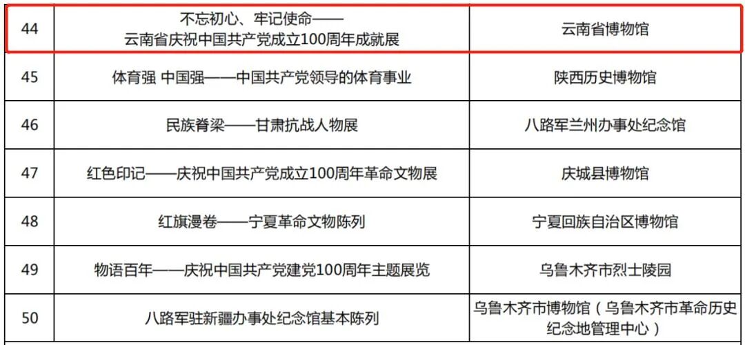 其中,云南省博物馆“不忘初心 牢记使命——云南省庆祝中国共产党成立100周年成就展”入围庆祝建党百年主题展览评选;澄江化石地世界自然遗产博物馆“澄江化石地世界自然遗产博物馆基本陈列”、德宏州博物馆“西南丝绸之路上的璀璨明珠:德宏”入围境内展览评选。