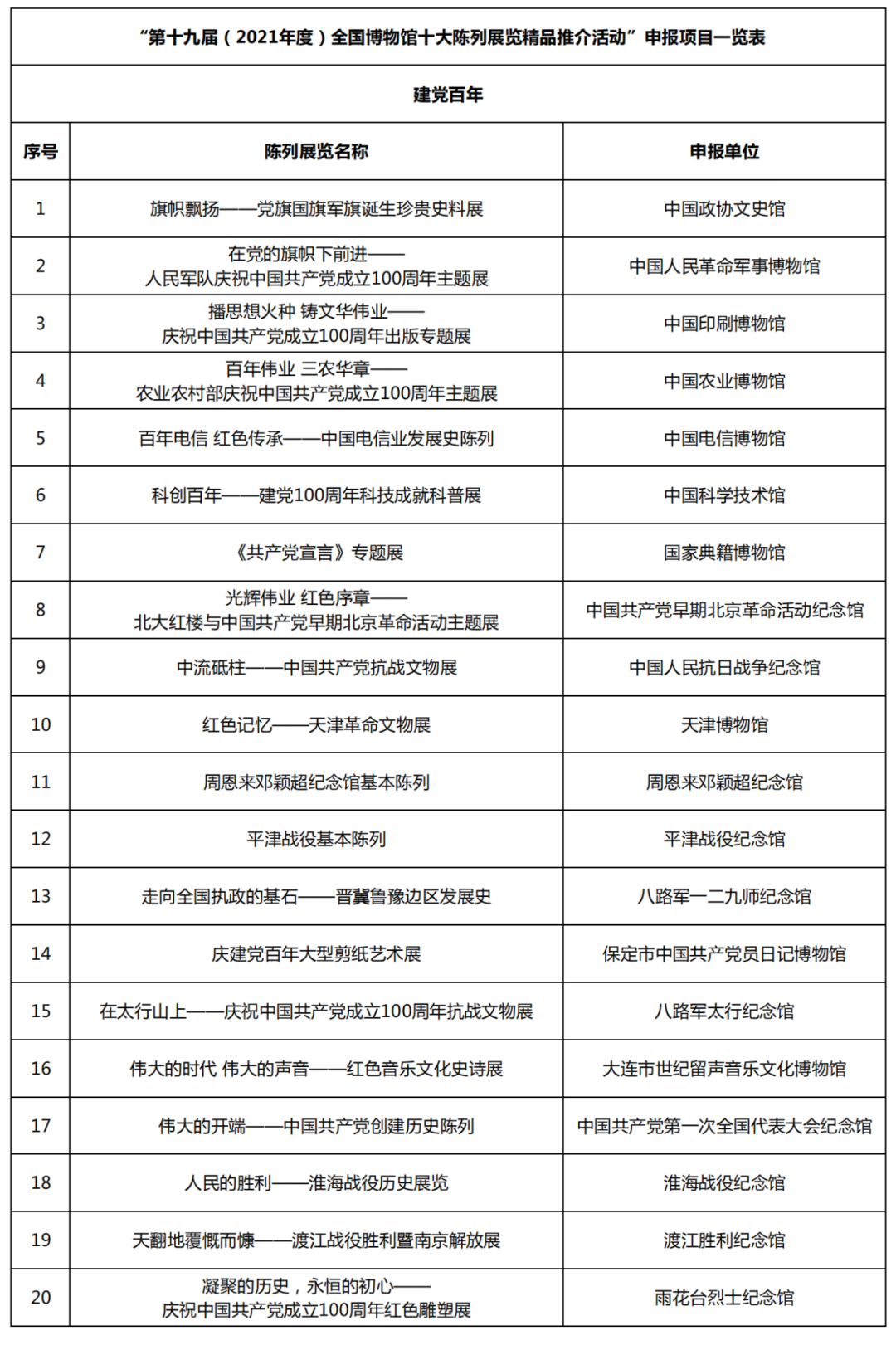 由国家文物局指导,中国博物馆协会、中国文物报社组织开展的第十九届(2021年度)全国博物馆十大陈列展览精品推介活动自启动以来,得到了中央及军队系统、全国各省级文物行政部门和文博单位的积极响应和支持,在规定的申报期限内,共申报项目157个,其中境内展览项目146个(其中庆祝建党百年主题展览50个),出入境展览项目11个(其中出境展6个、入境展5个)。申报项目涉及30个省、自治区、直辖市,申报数量创历史新高。