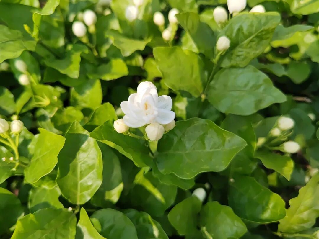 走近一看,茉莉花的枝干比较纤细,像一个亭亭玉立的姑娘,那白色的花苞从层层叠叠的绿叶中露出了娇羞的小脸,盛开的小花朵藏匿在其中,就像姑娘微笑的脸庞,玲珑娇小、却又楚楚动人。