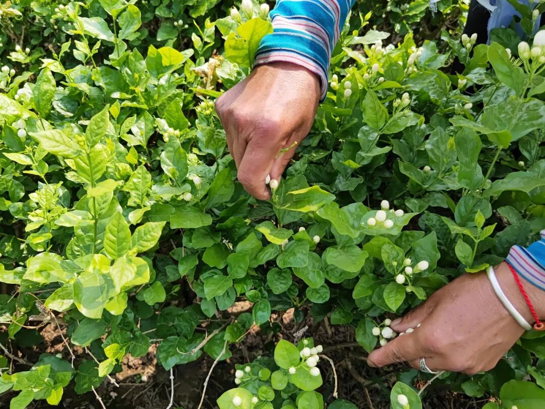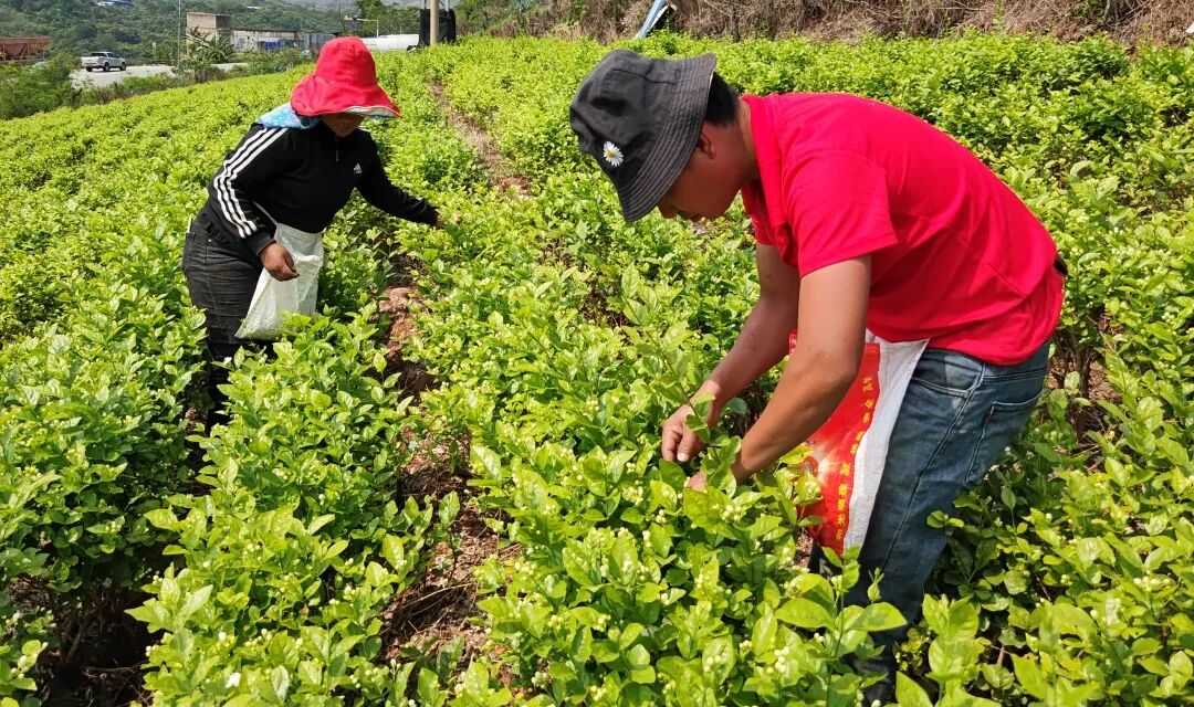 花农们顶着烈日采摘花朵,希望可以赶早卖个好价钱,茉莉花种植为当地农户增加了一条增收致富的新路子。