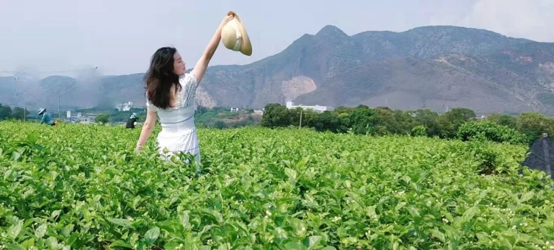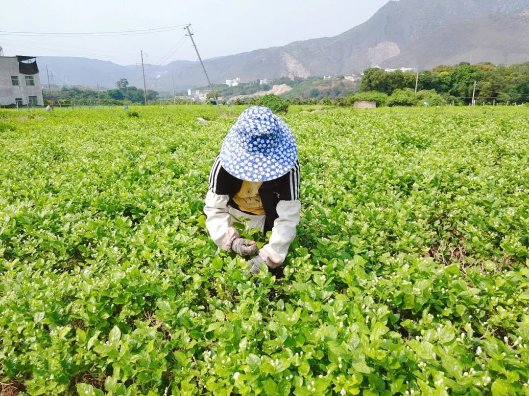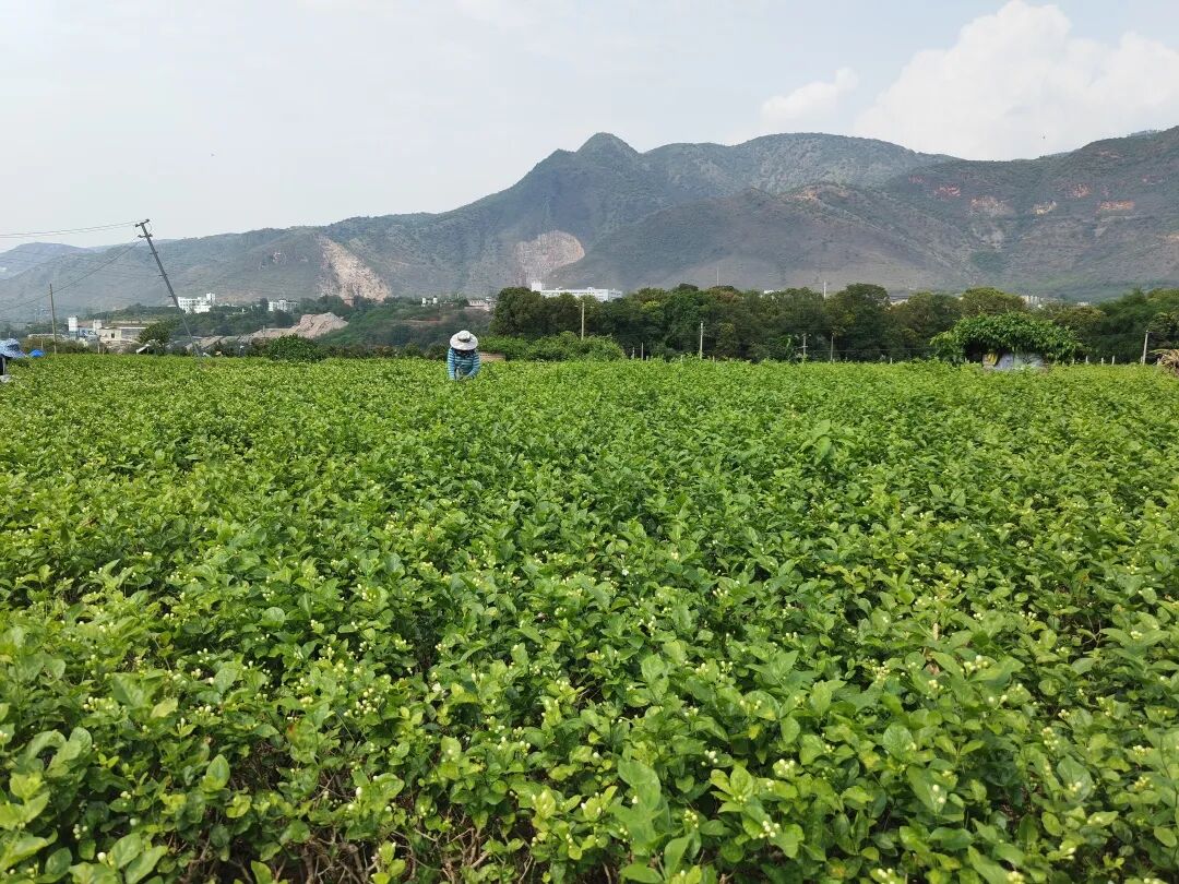 在元江县江东片区和小寨子组等片区的茉莉花种植地,大片的茉莉花特别显眼,远远望去绿油油的一片,白色的花朵像点点繁星坠落其中,让人忍不住想走进花海看个究竟。