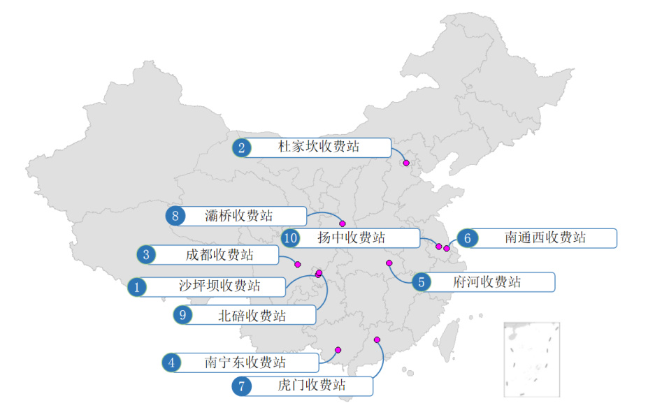 易拥堵缓行收费站。预计清明期间易发生拥堵缓行的收费站主要有G4京港澳高速北京杜家坎收费站,G30连霍高速西安灞桥收费站,G72泉南高速南宁东收费站,G75兰海高速重庆北碚收费站,G93成渝环线高速成都收费站、重庆沙坪坝收费站,S1岱黄高速武汉府河收费站,S3广深沿江高速东莞虎门收费站,S19通锡高速南通西收费站,S35泰镇高速镇江扬中收费站等,如图10所示。