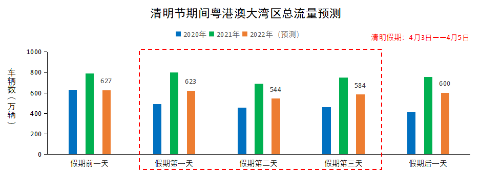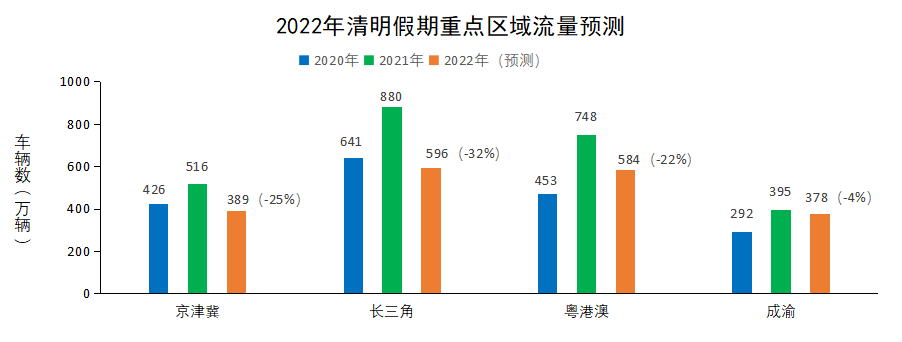 粤港澳大湾区。目前,大湾区内深圳、东莞分区域调整疫情防控政策,正有序恢复生产生活秩序,但封控区与管控区仍然严格执行区域交通临时管制等措施,预计清明期间大湾区出行量显著减少,日均流量约580万辆,同比2021年下降22%左右,同比2020年增长24%左右,如图8所示。大流量路段仍主要集中在珠三角区域及粤西方向,粤东、粤北主干道车流也较大。由于疫情影响,粤湘、粤桂之间的省际车流量有所下降,广州、深圳等中心城市进、出城方向和景区周边收费站车流压力也相对减小。