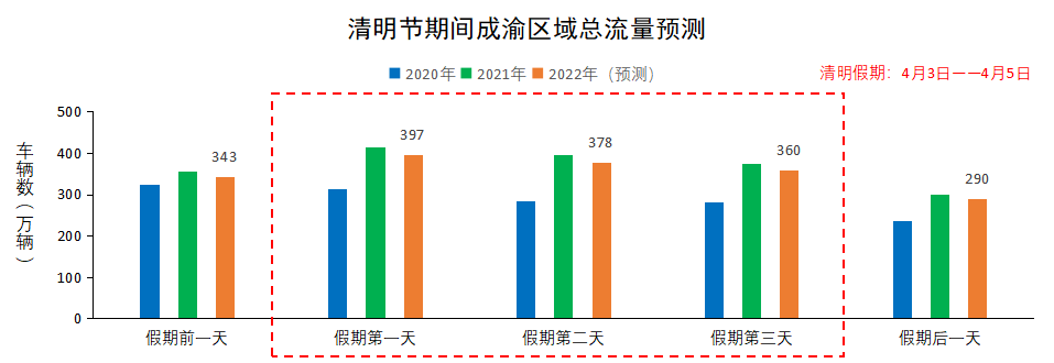 成渝地区。清明期间预计成渝区域日均流量约为380万辆,同比2021年下降4%左右,同比2020年上升29%左右,如图9所示。清明期间,以川渝之间中、短途集中出行为主,占比超过总出行量的50%。假期首日是流量高峰,预计超过400万辆,之后流量呈逐日下降趋势。高速公路流量较大的路段和繁忙的高速公路服务区及收费站多集中在成都市区和重庆主城区及其相关放射线。