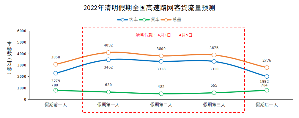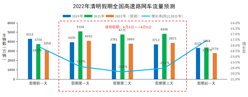 2022年清明假期从4月3日到4月5日,共计3天,7座以下(含7座)小型客车通行收费公路免收通行费,具体免费通行时段为4月3日(星期日)0:00到4月5日(星期二)24:00,以车辆驶离出口收费车道的时间为准。根据历年清明假期路网运行特征,结合国内疫情形势及防控政策要求,以及公众出行意愿分析,交通运输部路网监测与应急处置中心联合相关单位,发布2022年清明假期全国公路网运行情况研判分析报告。↓↓↓