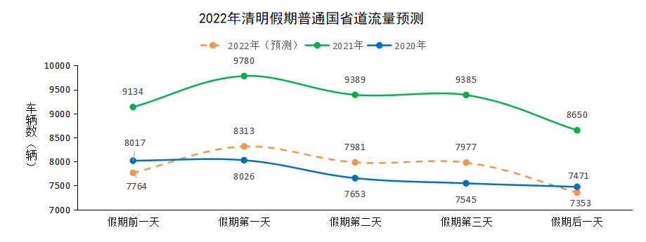 预计清明假期普通国省道日均断面交通量约为8000-8100辆,同比2021年(9518辆)下降14%-16%,同比2020年(7741辆)上升3%-5%,如图4所示。