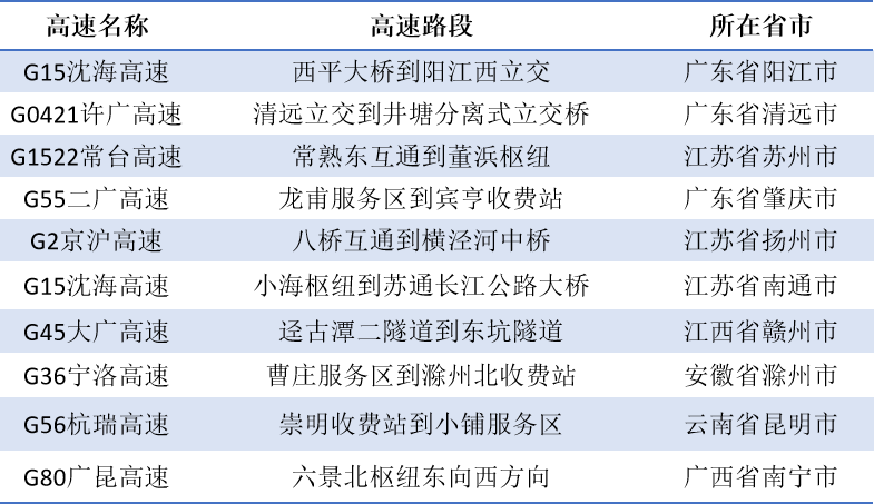 易拥堵缓行路段。预计全国高速公路易发生拥堵缓行路段主要有:G2京沪高速江苏扬州段,G15沈海高速广东阳江段、江苏南通段,G36宁洛高速安徽滁州段,G45大广高速江西赣州段,G55二广高速广东肇庆段,G56杭瑞高速云南昆明段,G80广昆高速广西南宁段,G0421许广高速广东清远段,G1522常台高速江苏苏州段等。如表1所示。
