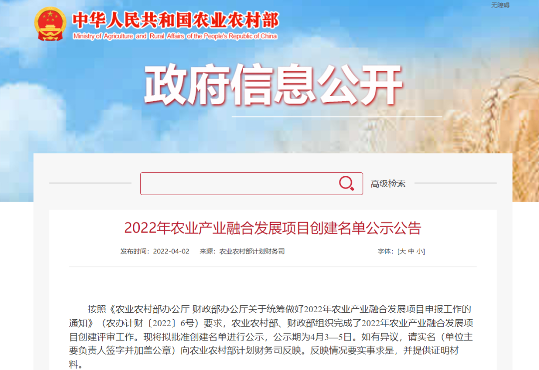 按照《农业农村部办公厅 财政部办公厅关于统筹做好2022年农业产业融合发展项目申报工作的通知》(农办计财〔2022〕6号)要求,农业农村部、财政部组织完成了2022年农业产业融合发展项目创建评审工作。现将拟批准创建名单进行公示,公示期为4月3—5日。如有异议,请实名(单位主要负责人签字并加盖公章)向农业农村部计划财务司反映。反映情况要实事求是,并提供证明材料。