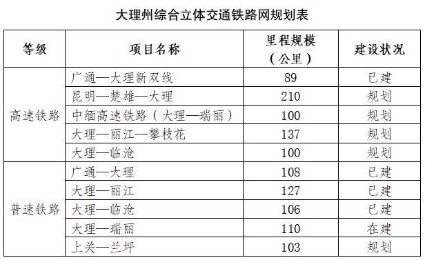 规划形成以大理市为中心、高速铁路为骨架、普速铁路为补充的多路畅通“五主五辅”铁路网,总里程规模约1190公里。