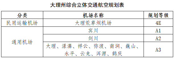 完善通用机场布局。鼓励在适宜的库湖区发展通用航空作业。全州规划宾川A1级通用机场,剑川A2级通用机场,漾濞、祥云、弥渡、南涧、巍山、永平、云龙、洱源、鹤庆等9个A3级通用机场,基本实现通航飞行“县县通”,提升空中通达性,提高航空基本公共服务水平。