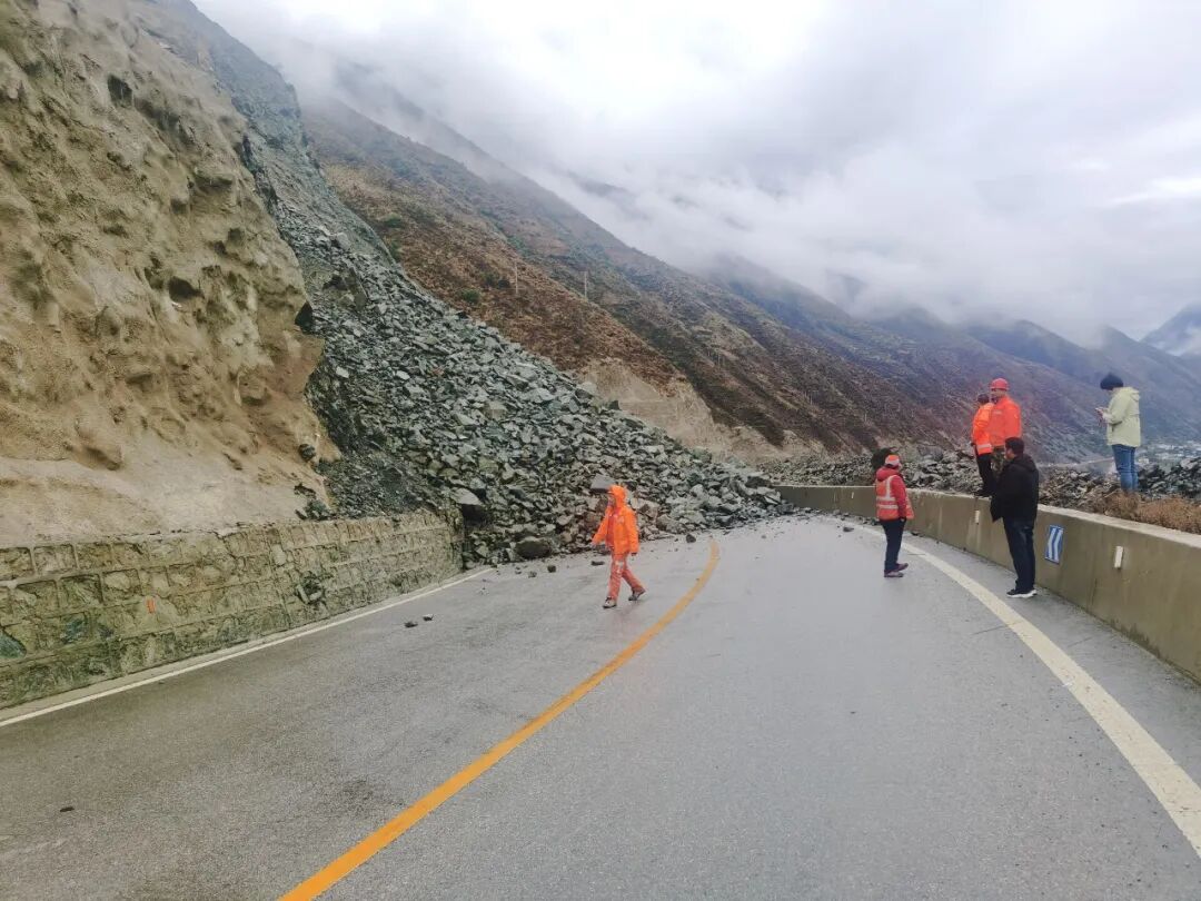 德钦至维西S237(德勐线)K26+600M处,德钦县云岭乡段佳碧隧道出口中桥,被巨大落石击中桥面,桥体严重受损,不具备通行条件,已对该路段进行交通管制,小型车辆可从德维老路绕行,大型车辆无法通行。