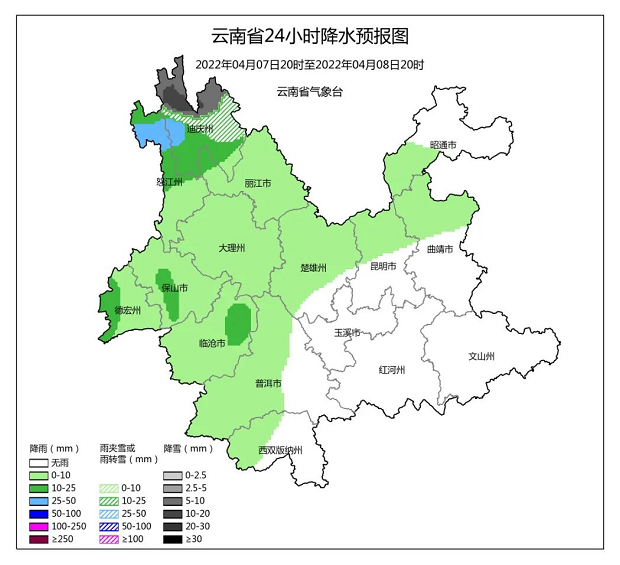 迪庆北部阴有中雪局部大雪,怒江中北部、迪庆南部、丽江北部阴有中雨局部大雨,文山东部多云,其它地区阴天间多云有小雨局部中雨。