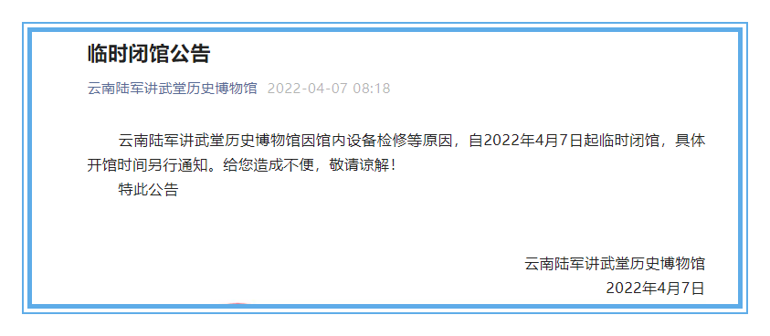 4月7日,云南陆军讲武堂历史博物馆发布临时闭馆公告。详情如下: