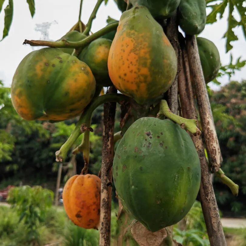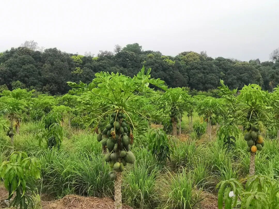 行走在栽满木瓜树的田间小道上,绿色的木瓜树齐齐排排映入眼帘,树枝上已经结满了大小不一的木瓜,呈现出一派丰收的景象。