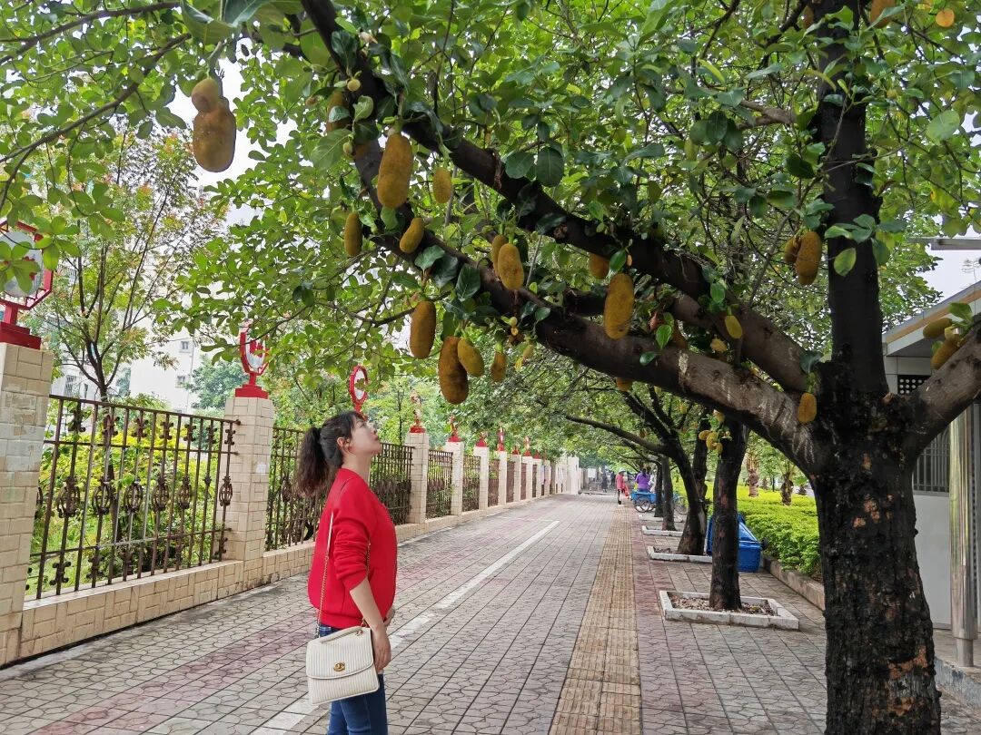 在元江,“果香”不止在果园,在县城向阳路和淇水路的道路两旁、一排排绿色的菠萝蜜树非常显眼,一个个菠萝蜜吸引了不少路人驻足观看,除此以外,酸角树、芒果树、龙眼树等果树扮靓了整个县城,到处花果飘香,彰显出元江热带气候的特点,成为了城市一道别样的风景。