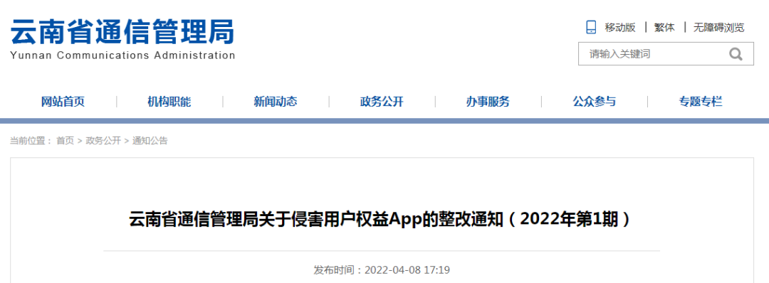 4月8日,云南省通信管理局网站发布关于侵害用户权益App的整改通知(2022年第1期)。依据《网络安全法》《电信和互联网用户个人信息保护规定》等法律法规,按照《关于开展纵深推进App侵害用户权益专项整治行动的通知》(工信部信管〔2020〕164号)工作部署,云南省通信管理局委托云南省互联网协会,组织对在云南省取得电信业务经营许可、备案或开发者工商注册地在本辖区的部分App进行了技术检测,发现9款App存在违法违规收集使用个人信息等问题。