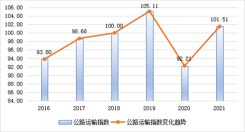 公路运输指数为101.51点,同比增长10.09%。运输基础设施建设不断推进,公路通车里程同比增长2.88%,全省载运工具数同比增长5.48%;绿色运输发展稳步推进,高速ETC使用率继续保持较高水平。同时,受新冠疫情持续影响,道路运量呈现出客减货增的态势,客运量同比下降22.13%,货运量同比增长11.65%。客、货运输工具利用效率分别增长4.72%、12.56%。