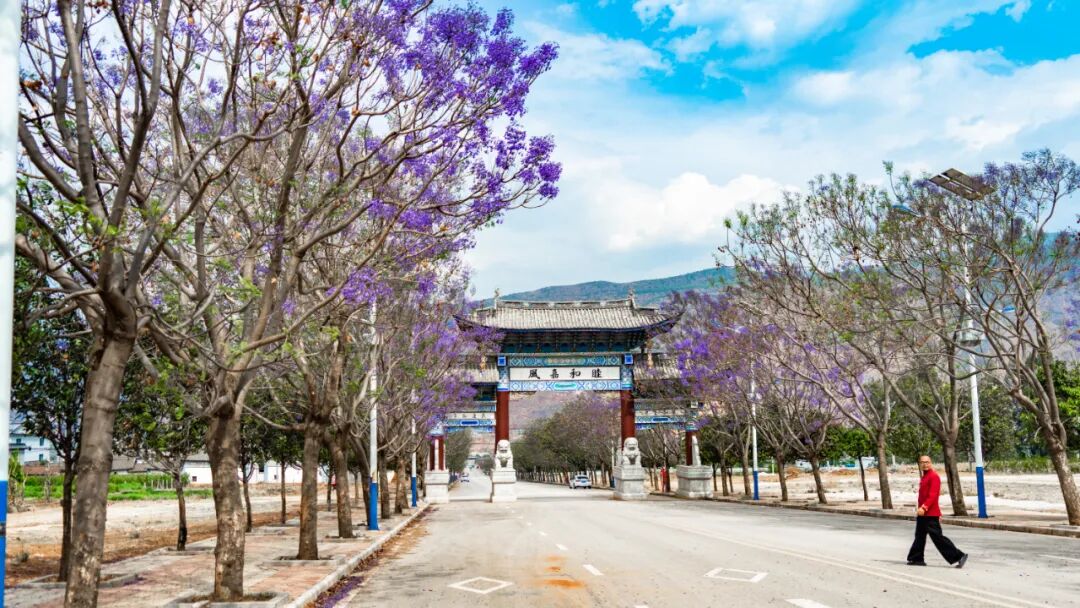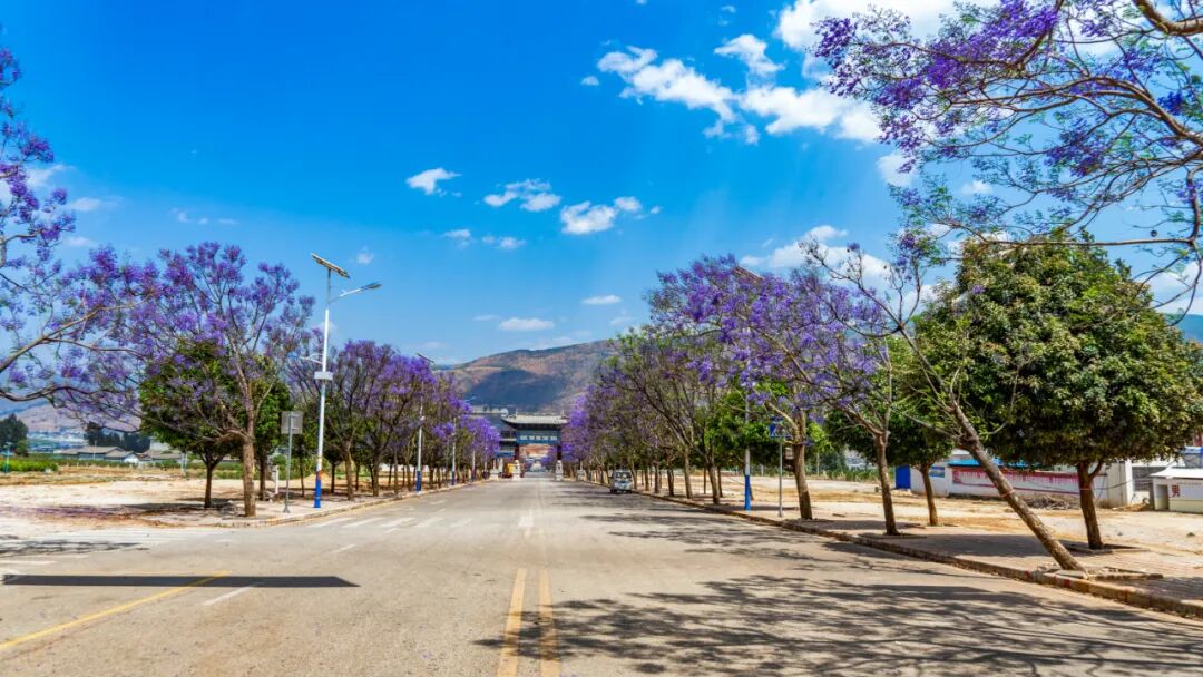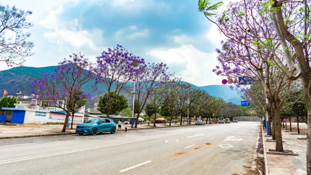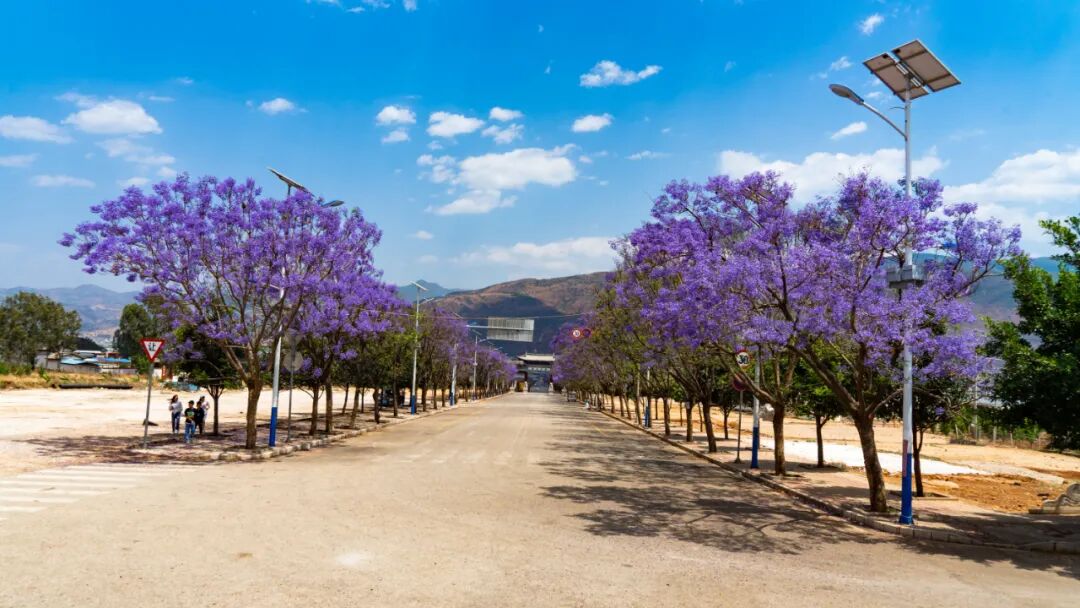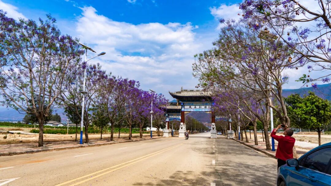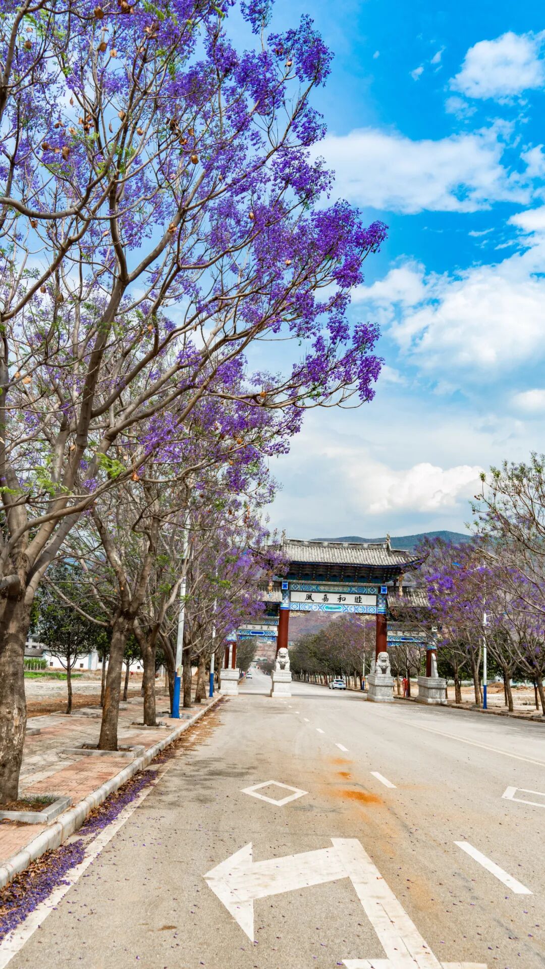 每年的蓝花楹盛开之际,就会引得周边游人前来观赏、拍照、打卡。在这里赏花,既可以与蓝花楹拍照留念,亦可前往边屯文化博物馆参观,了解永胜边屯名郡的历史。