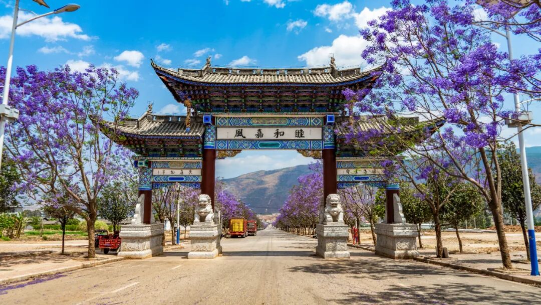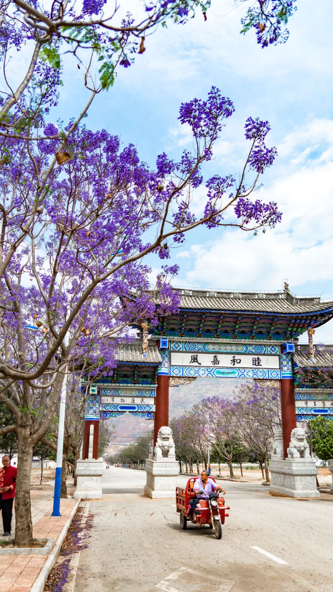 在蓝花楹大道上,还有着两个高大的牌坊,在蓝花楹的映衬下,尽显边屯之乡的别样风采。