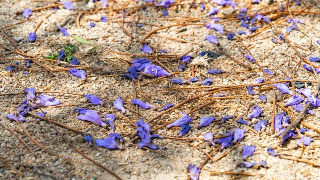 蓝花楹,以其独有的沉静之色,让人念念不忘。春风掠过,花朵悠然飘落在地,格外美丽,宛如堕入一片蓝紫色的梦境中。于树下驻足,眼眸中尽是一场场缤纷的花雨。