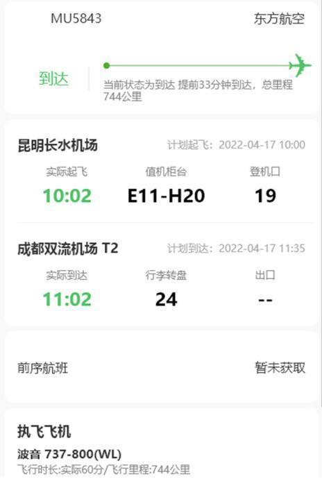 复飞首趟航班为MU5843,于10时左右从昆明长水国际机场起飞,目的地成都双流国际机场。之后该航班执飞MU5844返航任务,在13时左右由成都双流国际机场起飞返回昆明长水国际机场。