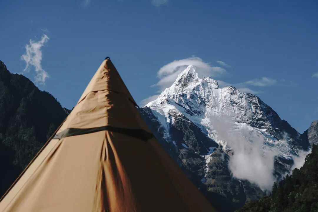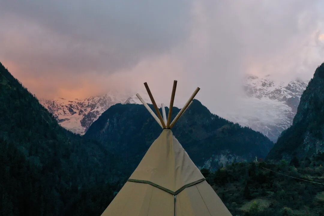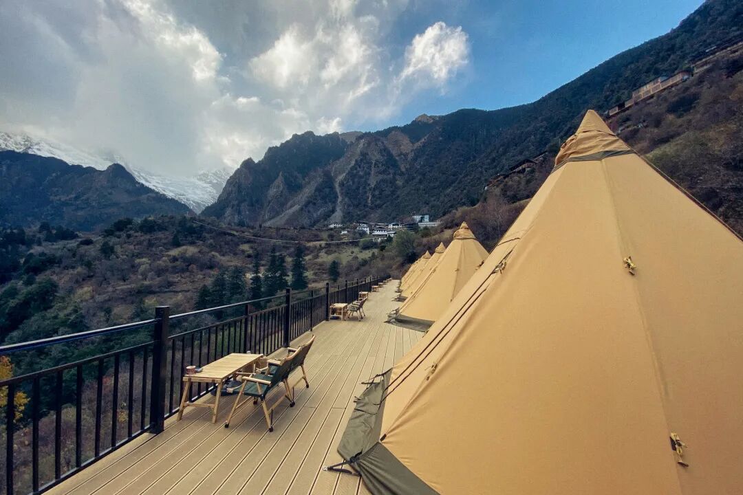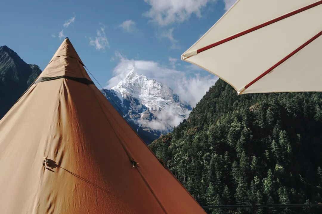 松赞雨崩帐篷营地,分为住宿区和公共区两部分。其中住宿区设有10顶萨米游牧风尖顶帐篷,公共区域设有天幕休闲帐篷和餐厅活动帐篷。