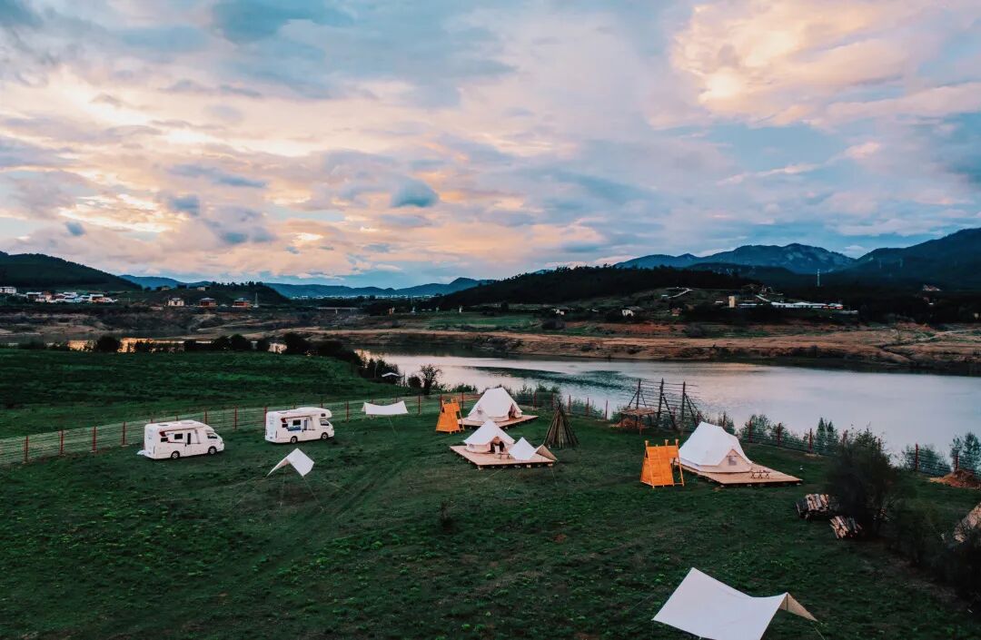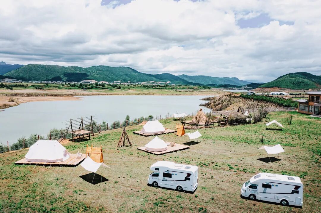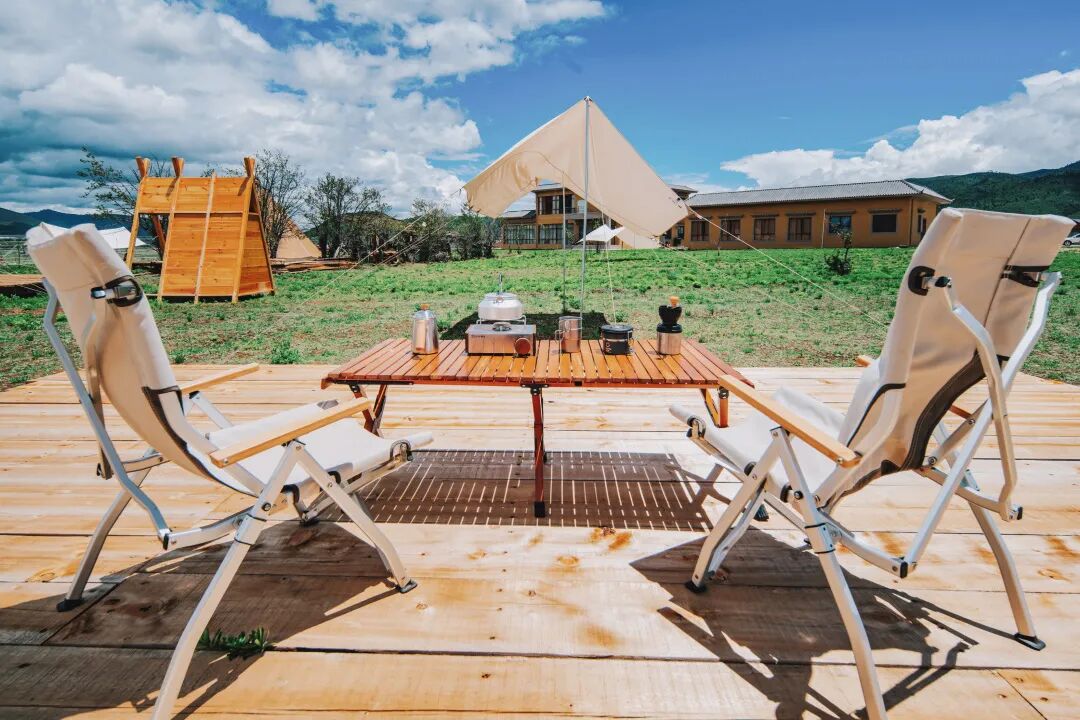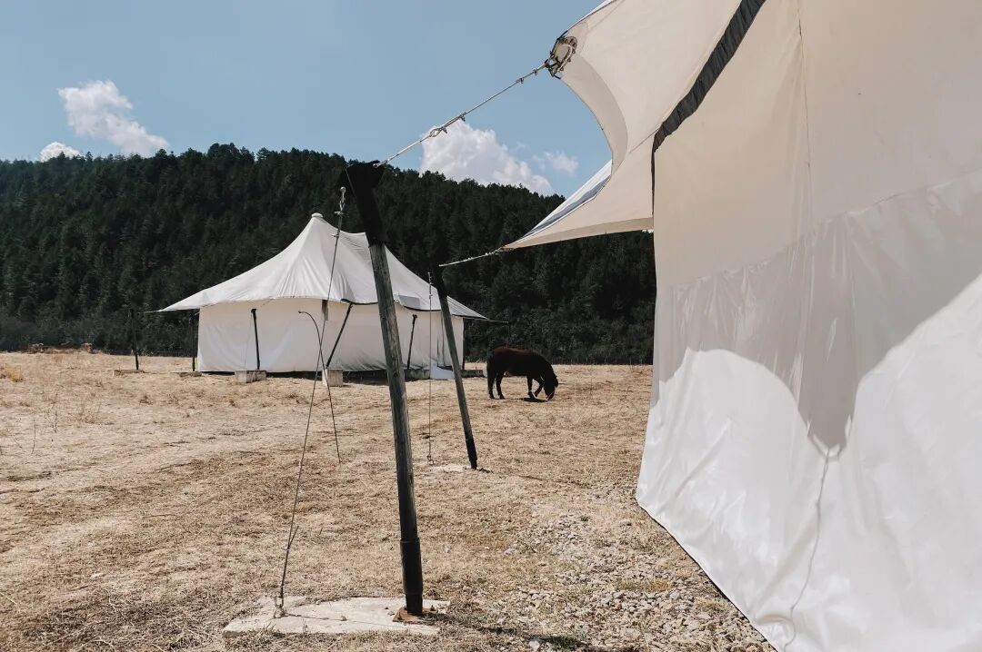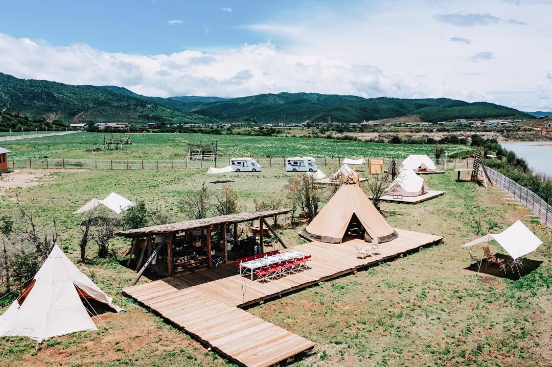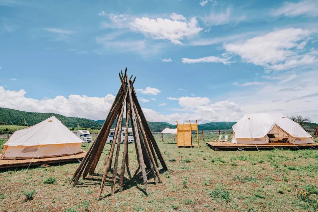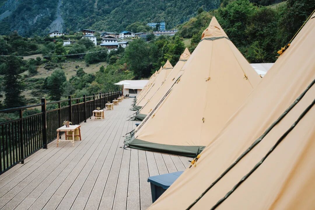 帐篷营地在青山下,绿水旁,与当地民居为邻,可近观山林,远眺雪山。和周围的田园风光,营造出人与自然和谐相处的梦幻空间。