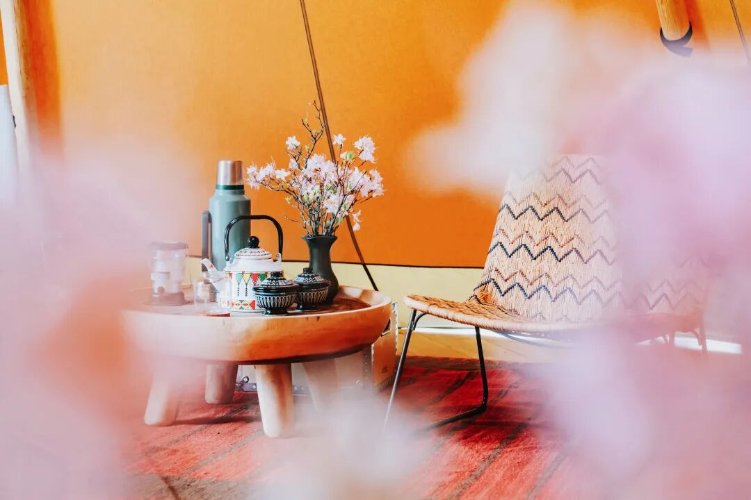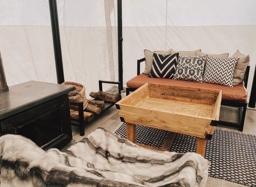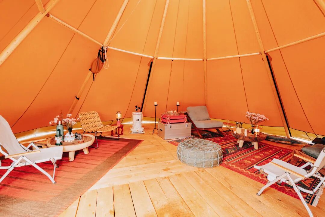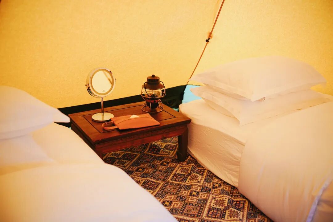 萨米游牧风的尖顶帐篷内舒适温暖,在野外也能保障一夜好眠。帐篷内选用了松赞酒店同款床垫、床品,熟悉的柔软与舒适,让你有回到家中的亲切感。
