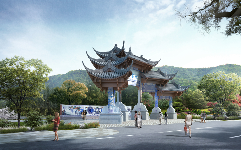 牌楼作为中国古典建筑重要元素之一,常常布置于古建筑群的主要入口处,或者在中式园林中广泛使用,为某个街道或某个区域的标示性构筑物。本项目采用的牌楼又有其独特性,弧形构造面向红塔大道,五门楼从两边层层递进到中间,如龙窑之外罩亦是层层递进,步步登高。挑檐下之木构采用滇中传统民居做法,而柱、梁、枋则采用青花彩绘纹样,重点突出窑址特色。