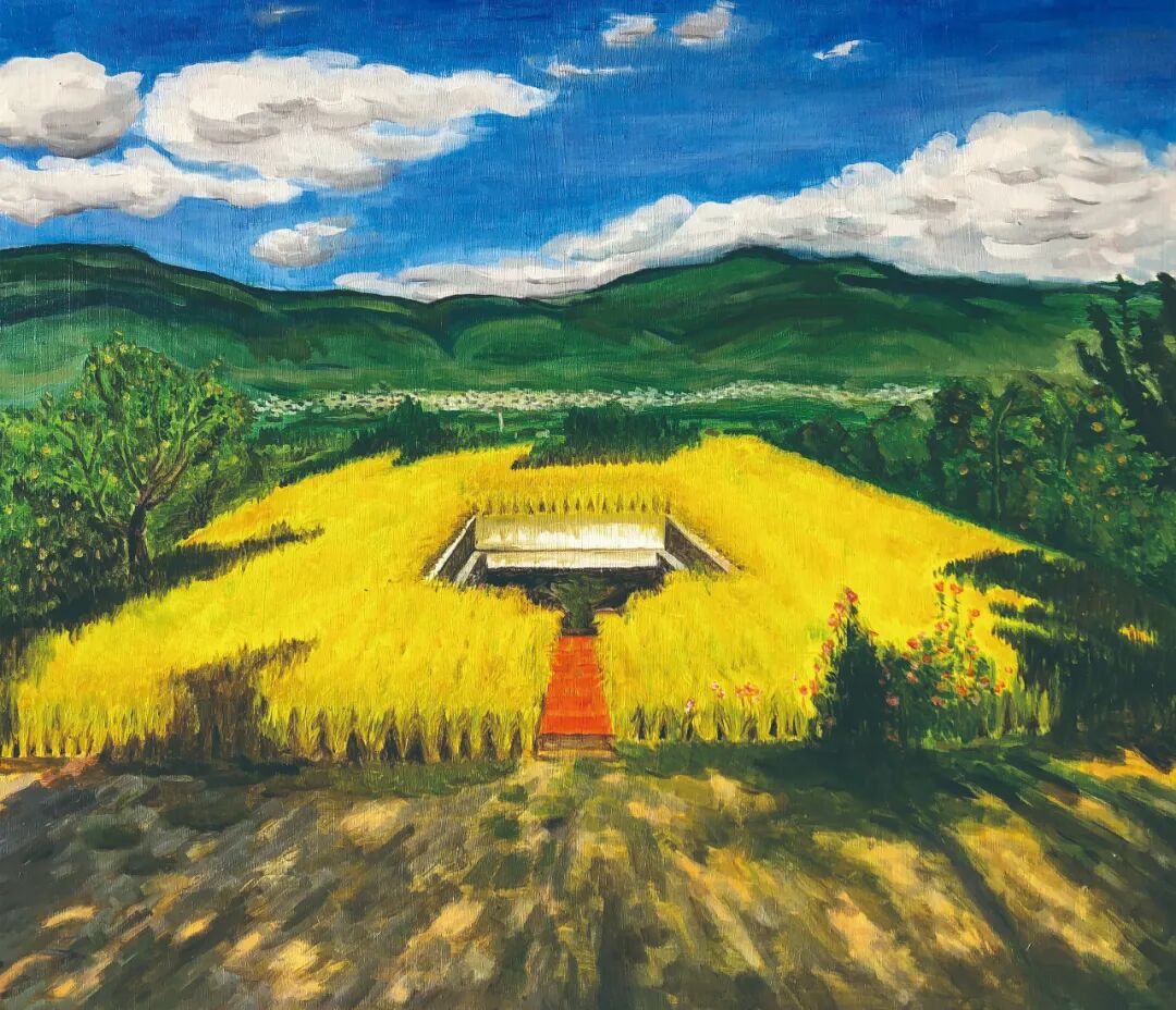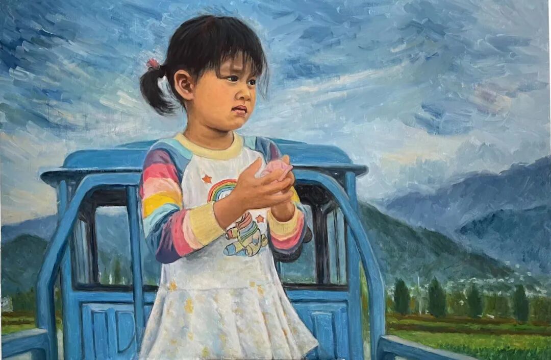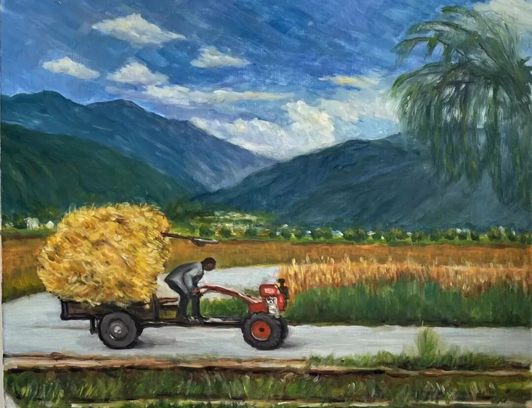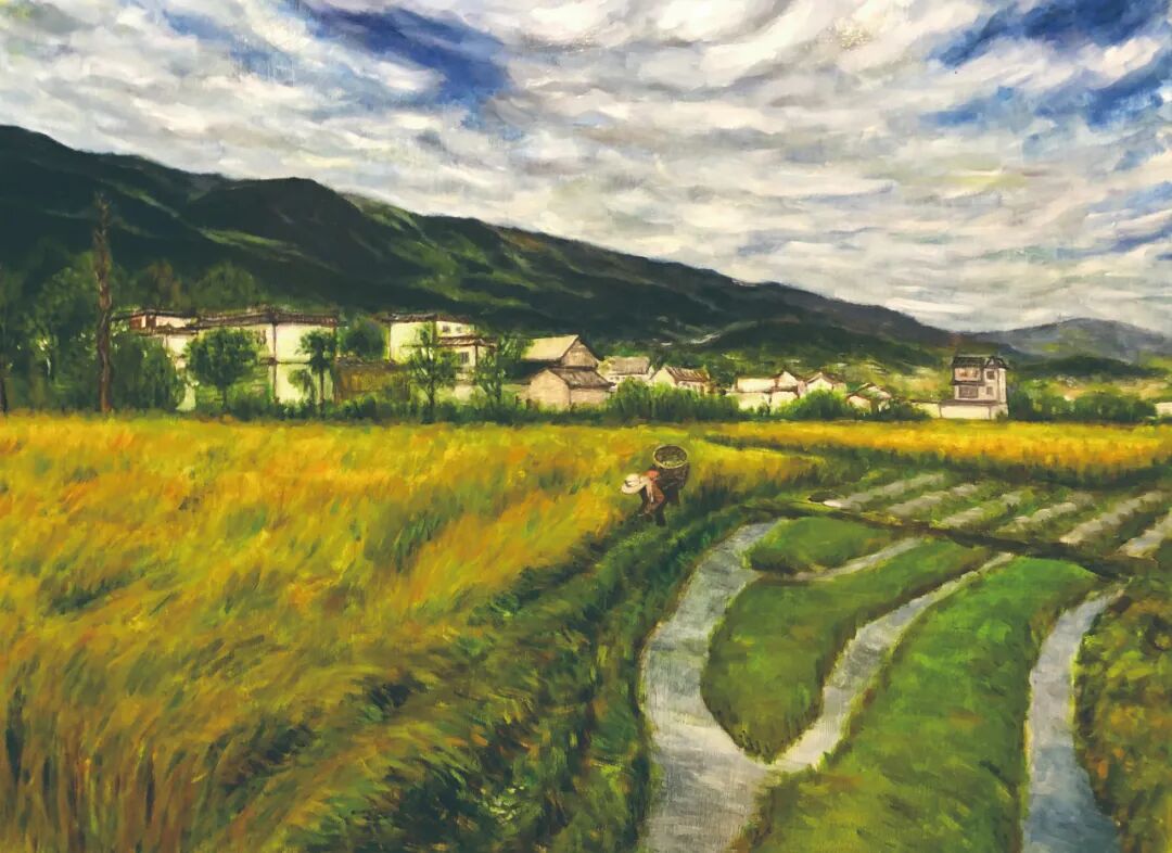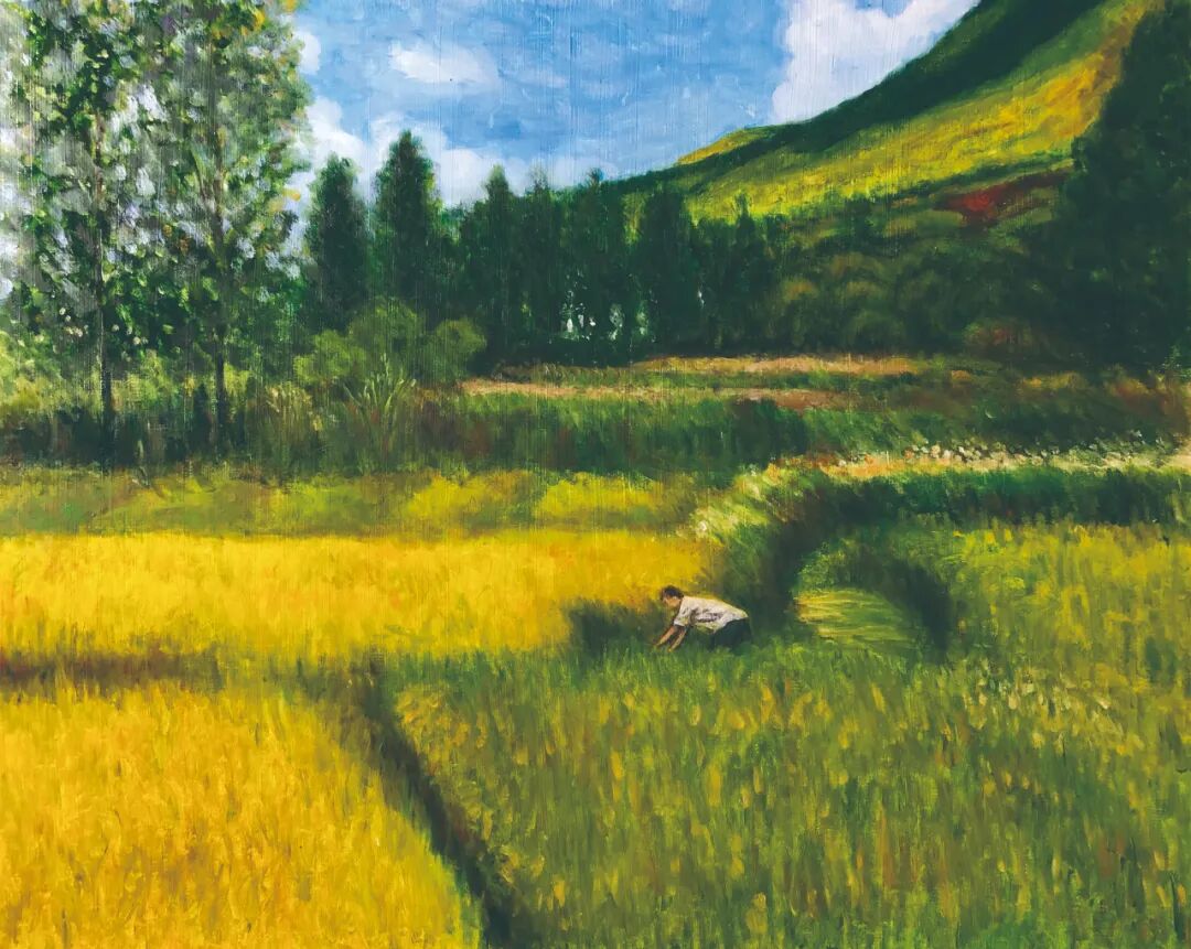 《空中稻田剧场》《凤羽河畔》《湿地》《去稻田剧场的路》《田园几何》《农人土地庙天马山》《红白马云》《远处的光怎么像雨?》……拿起画笔短短一年时间,姜军创作的凤羽题材作品,让小小的凤羽坝子放射出了欧洲古典主义式的光芒,因此,朋友们称他是“巴比松派”凤羽的驻坝画家“姜米勒”。