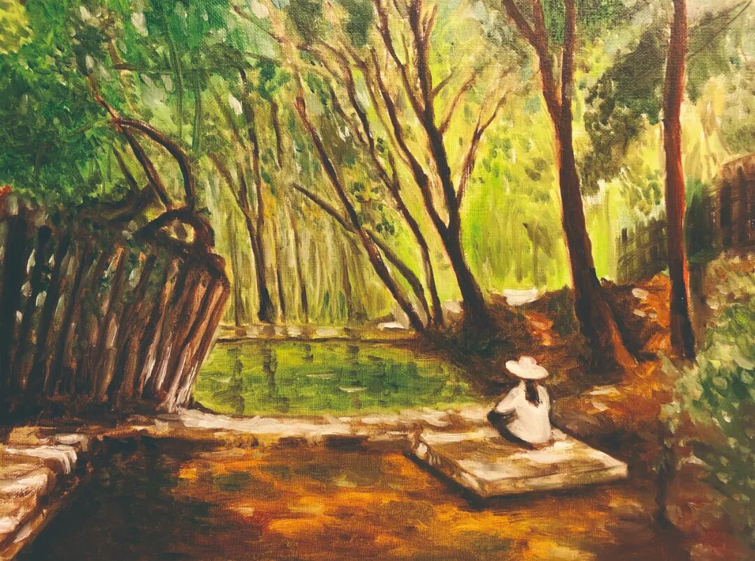 姜军在现场默默拍下三爷泉的照片。回京不久,他发来一张画,三爷泉边的石板上,一位白衣人背对盘腿而坐,头戴草帽,禅定悠然。不知道那个人是不是他自己内心的投射,但自此之后,凤羽成了他创作的源头和福地。