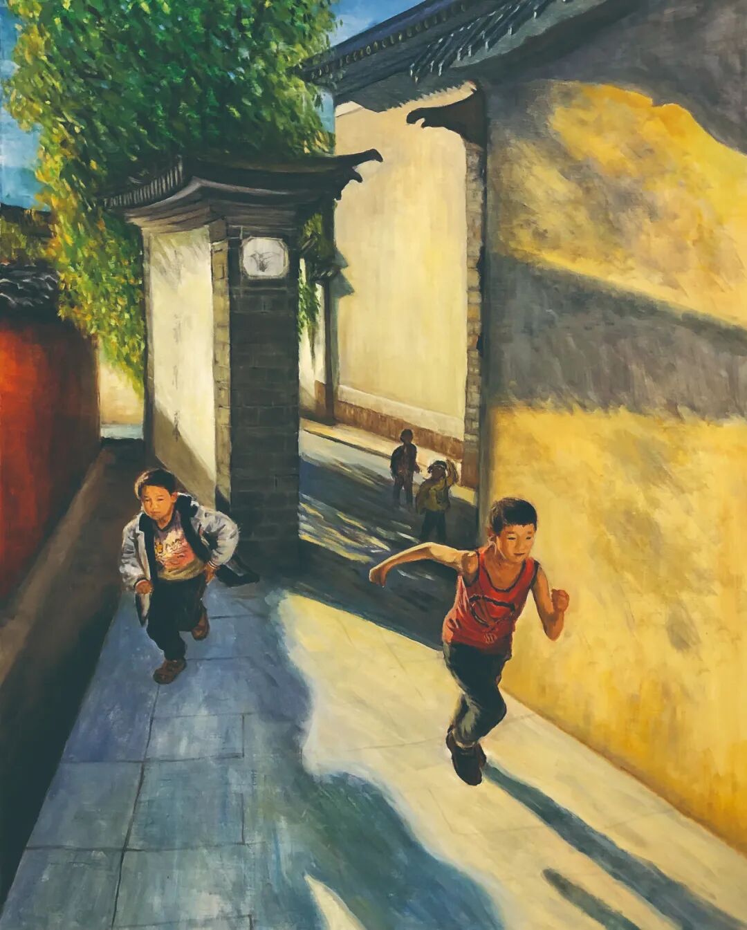 姜军沉迷于光线中,每天吃过晚饭就去散步,用手机将这里的色彩、线条、光影一一记录。次日清晨,吃过一大碗米线,他就去画室,将那些纪录在手机、收纳在心里的画面,魔术师般一点点呈现在画布上。至于午餐,往往一块面包,几包饼干就打发了。