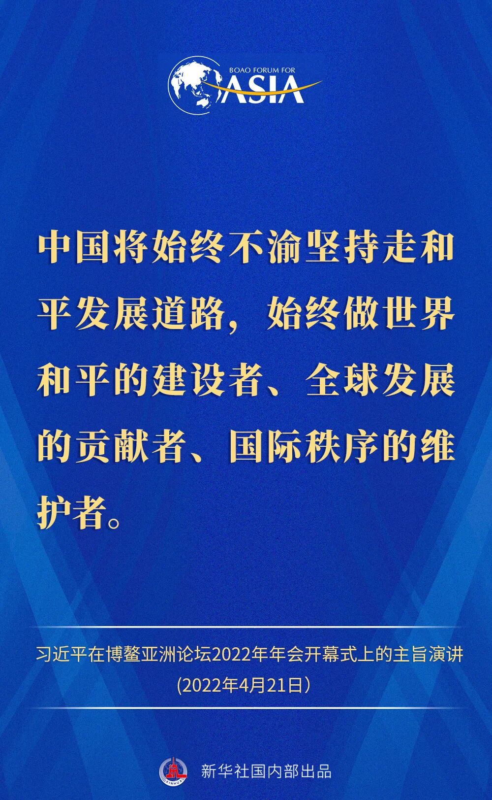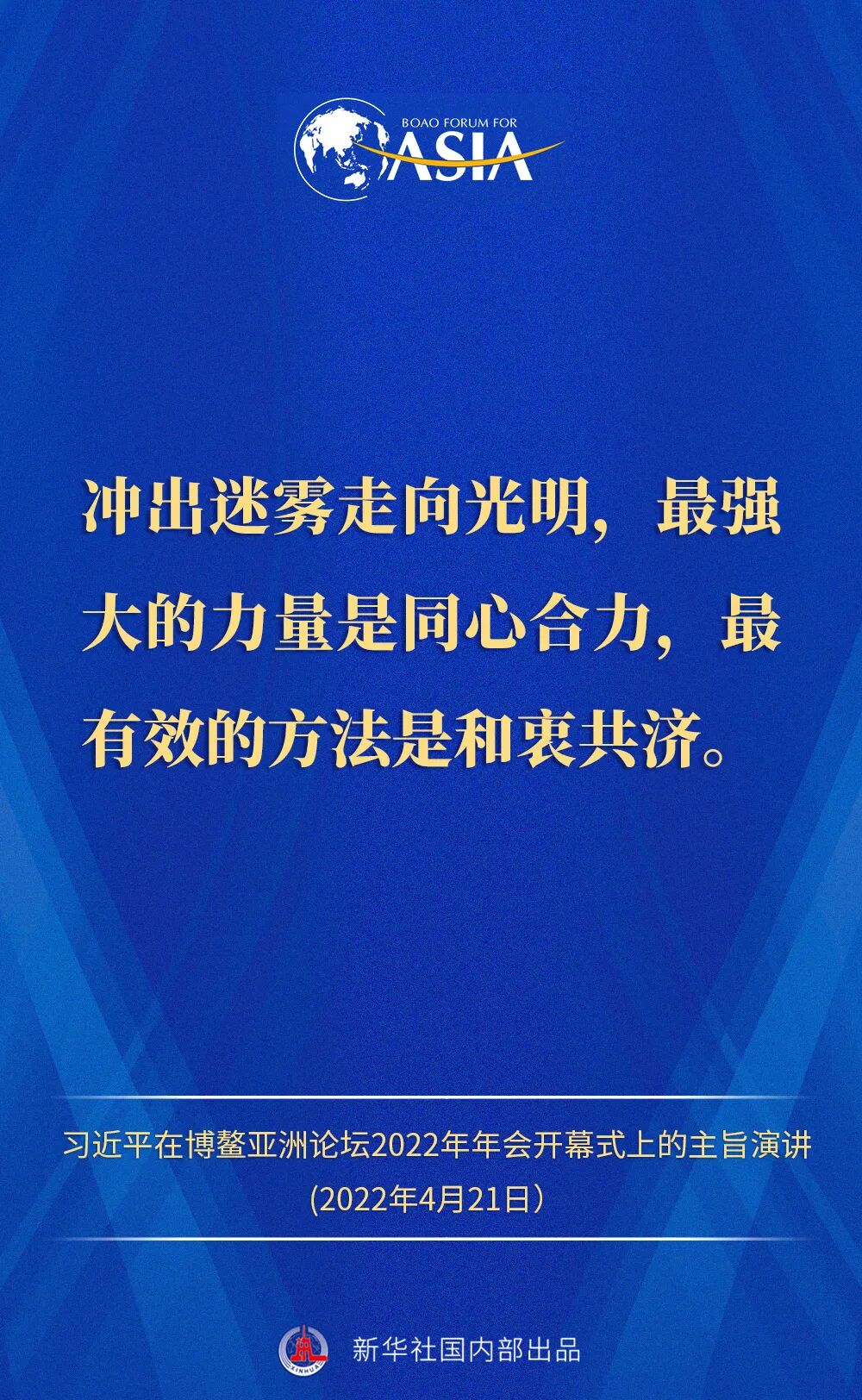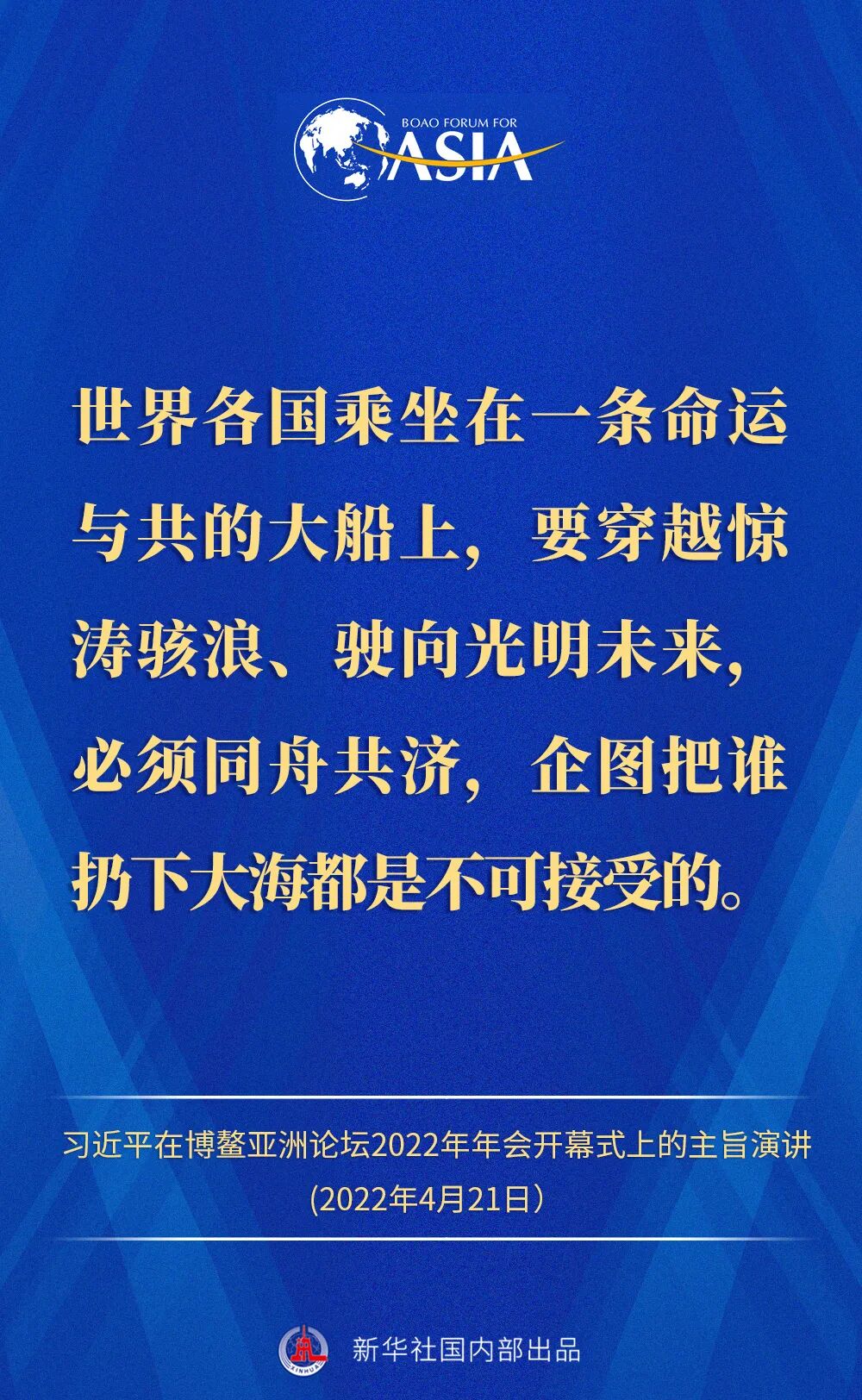金句来了!习近平主席在博鳌亚洲论坛2022年年会开幕式上的主旨演讲 2022-04-21 12:02 “新华视点”公众号 0 4月21日,国家主席习近平以视频方式在博鳌亚洲论坛2022年年会开幕式上发表题为《携手迎接挑战,合作开创未来》的主旨演讲。一起来看演讲金句! 来源 “新华视点”公众号 责编 童文文 审核 华芳