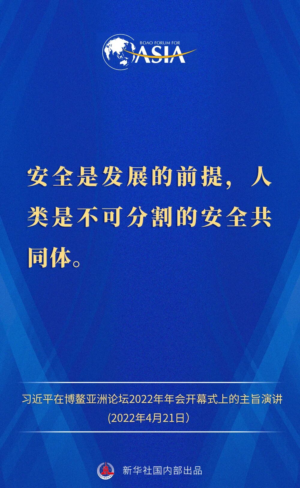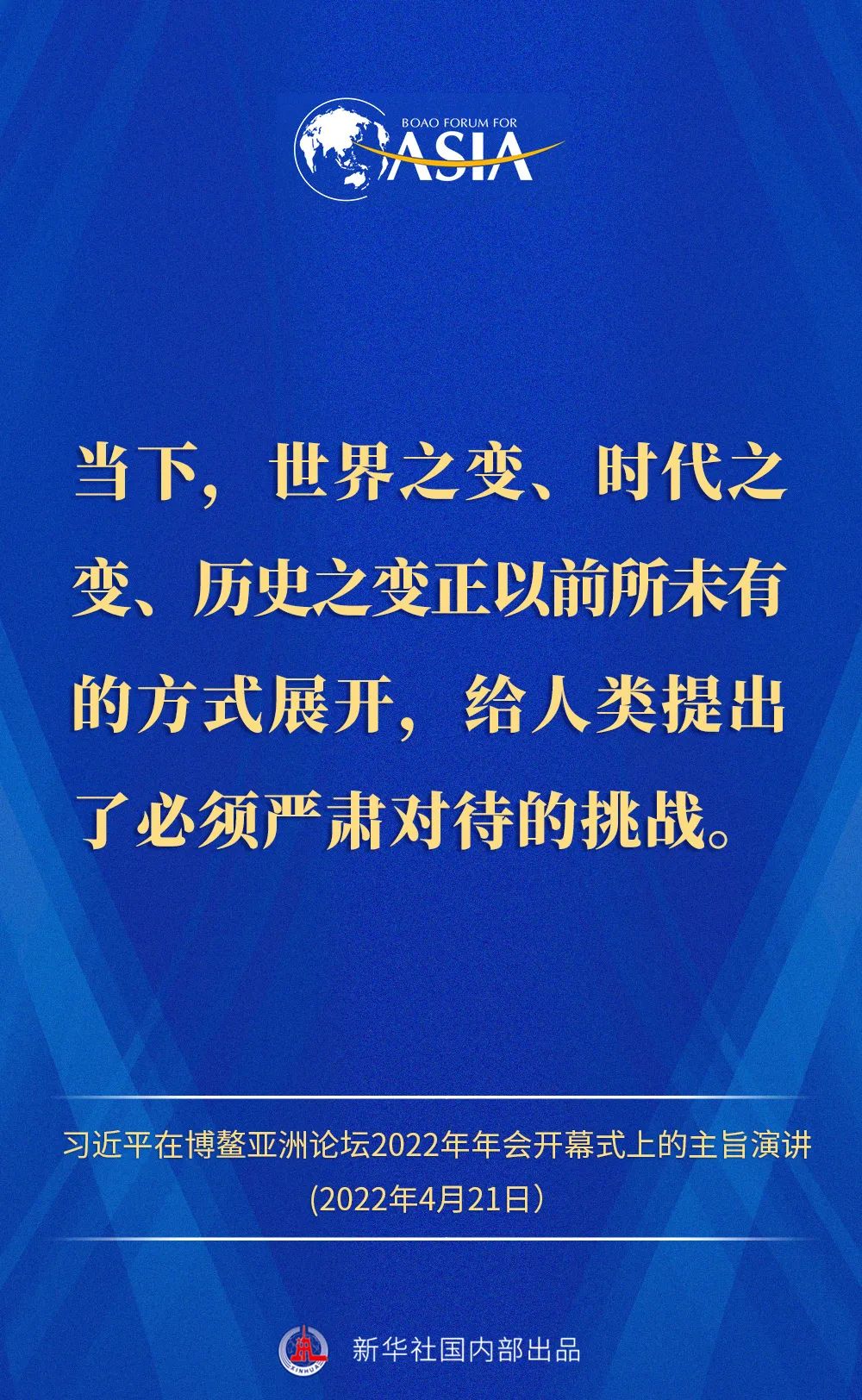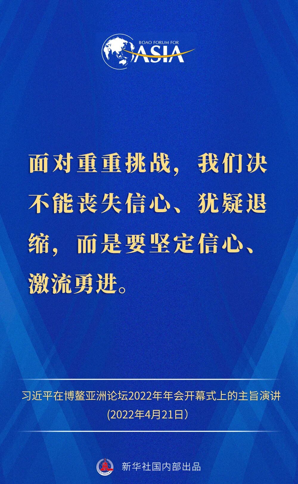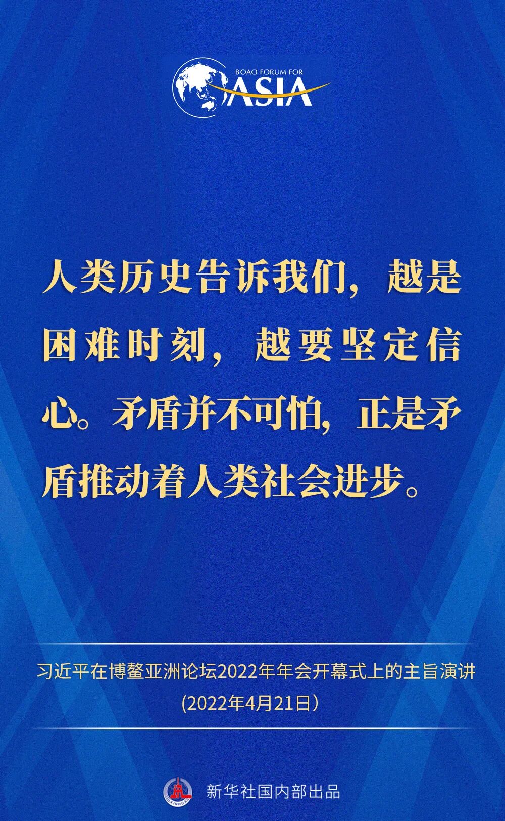 金句来了!习近平主席在博鳌亚洲论坛2022年年会开幕式上的主旨演讲 2022-04-21 12:02 “新华视点”公众号 0 4月21日,国家主席习近平以视频方式在博鳌亚洲论坛2022年年会开幕式上发表题为《携手迎接挑战,合作开创未来》的主旨演讲。一起来看演讲金句! 来源 “新华视点”公众号 责编 童文文 审核 华芳