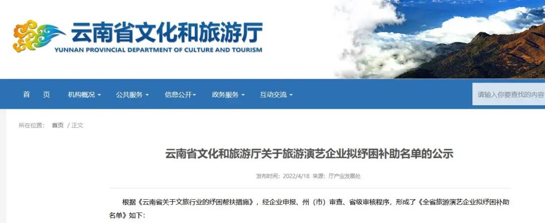 根据《云南省关于文旅行业的纾困帮扶措施》,经企业申报、州(市)审查、省级审核程序,形成了《全省旅游演艺企业拟纾困补助名单》如下:
