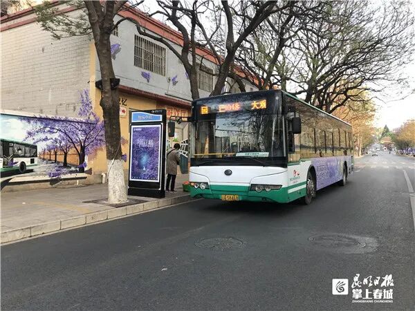 为方便市民到教场中路欣赏蓝花楹,昆明公交已开启“蓝花楹模式”。目前,104路已有7辆蓝花楹主题公交,这7辆公交车以紫色为主色调,车身也是紫色的,再加上蓝花楹图案,犹如一道行走的风景线。其中,有两辆104路除车身是紫色外,车厢里车顶、宣传板、拉手环、灯箱片等地方也都贴上了紫色的蓝花楹海报,给人耳目一新的感觉。公交104路,也成了穿梭在城市间的“蓝花楹”。