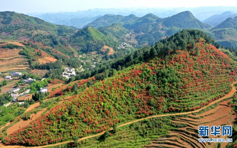 航拍镜头下杜鹃花开遍山野(4月13日摄)。新华网发(吴振坤 摄)