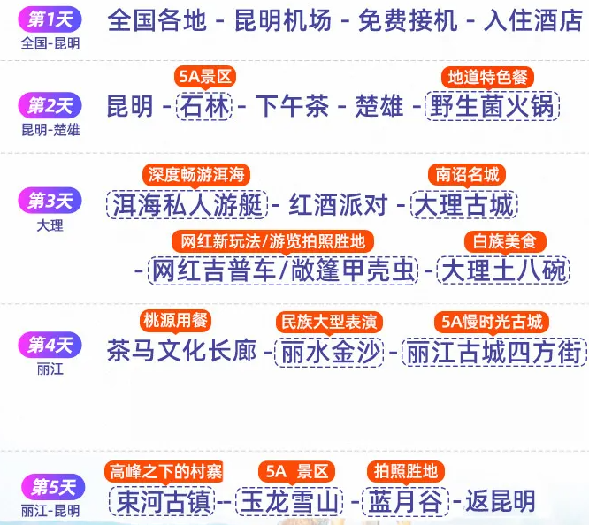 2022年4月25日,“游舆文旅大数据系统”监测到:云南昆明+大理+丽江+玉龙雪山+洱海5日4晚跟团游