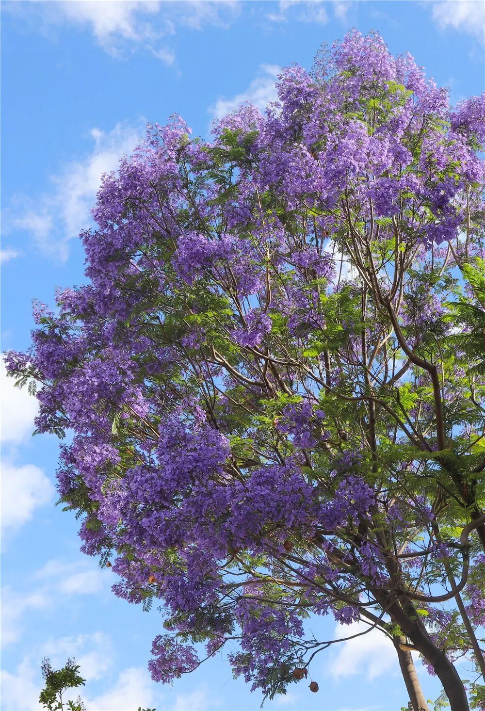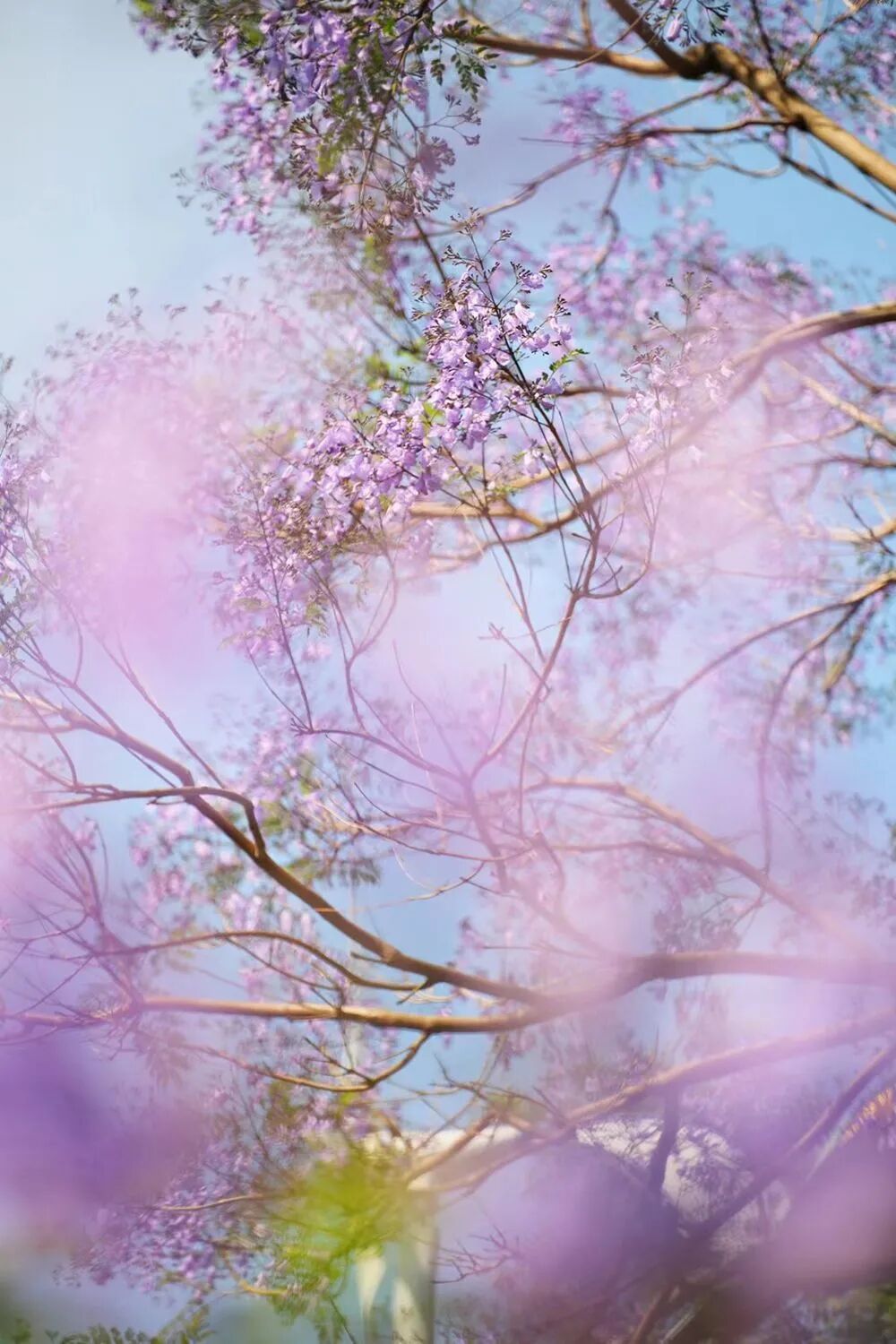 一片一片的蓝花楹,与蓝天白云交相辉映,清新淡雅,像极了青春偶像剧里的场景。