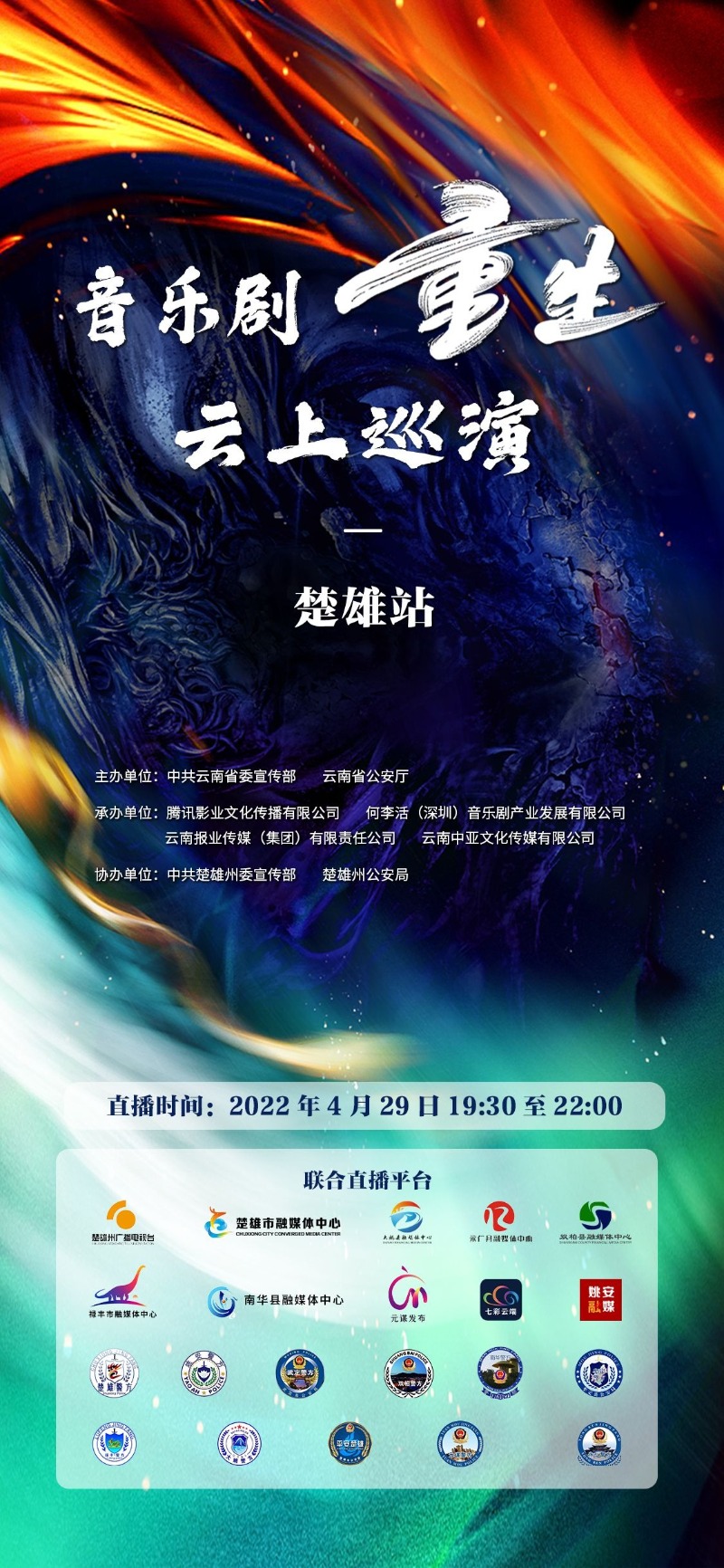 为进一步扩大对原创音乐剧《重生》的推广,加大该剧的影响力和传播力,让更多人欣赏到这部优秀艺术作品。此次“云上巡演”由中共云南省委宣传部、云南省公安厅主办,腾讯影业文化传播有限公司、何李活(深圳)音乐剧产业发展有限公司、云南报业传媒(集团)有限责任公司、云南中亚文化传媒有限公司承办。其中,“云上巡演”楚雄站由中共楚雄州委宣传部、楚雄州公安局协办。
