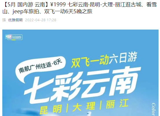 2022年4月29日,云南省文化和旅游厅综合执法监督局联合云南就爱去旅游文化传媒文旅大数据“游舆系统”监测到:【5月 国内游 云南】¥1999 七彩云南·昆明-大理-丽江逛古城、看雪山、jeep车旅拍、双飞一动6天5晚之旅