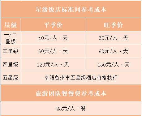线路成本参考价/人=星级房价/人×入住天数+团队餐价/人×用餐次数+A级旅游景区门票价格/人+用车费/人×用车天数+综合服务费/人×出游天数