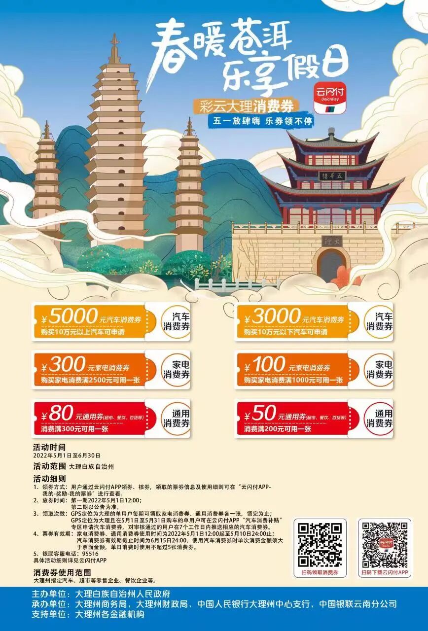 本次消费券发放由大理州人民政府主办,大理州商务局、大理州财政局、中国人民银行大理州中心支行、中国银联云南分公司,以及大理辖内各金融机构承办或支持参与。