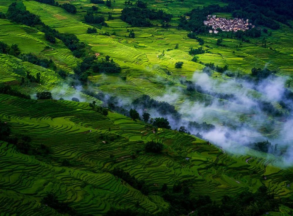 青绿遍野,层层梯田间薄雾悠然飘荡。(资料图片)