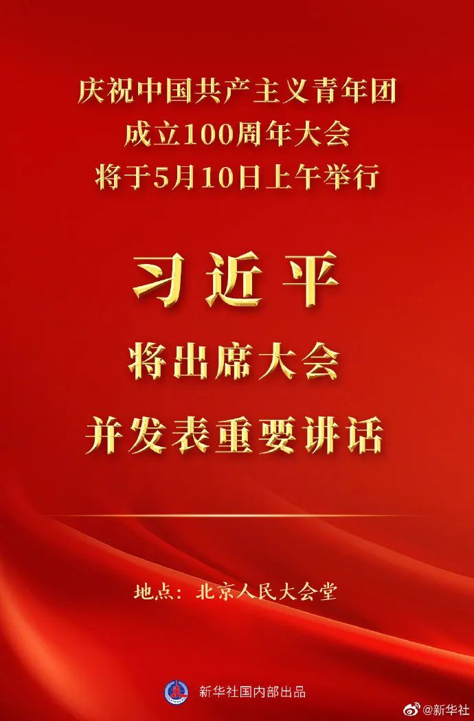 庆祝中国共产主义青年团成立100周年大会将于5月10日上午在北京人民大会堂隆重举行。中共中央总书记、国家主席、中央军委主席习近平将出席大会并发表重要讲话。