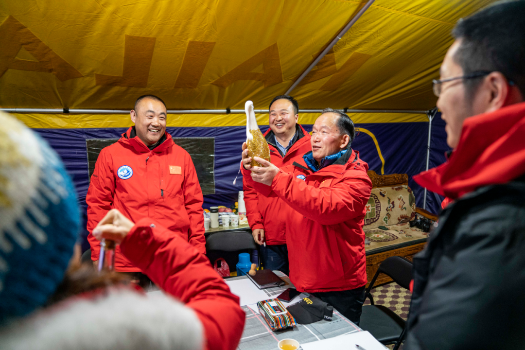 浮空艇创造纪录后,科考队员开香槟庆祝(5月15日 摄)。新华社记者 孙非 摄