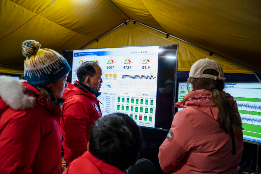 中科院院士、第二次青藏高原综合科学考察研究队队长姚檀栋(左二)查看观测仪器数据(5月15日 摄)。新华社记者 孙非 摄