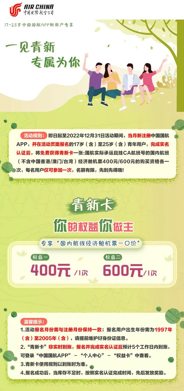 从即日起至2022年12月31日,年龄在17(含)-25(含)岁且未注册过中国国航APP的乘客,将有机会免费获得一张“青新卡”权益卡:包含400元、600元购买国内经济舱机票权益各一次。
