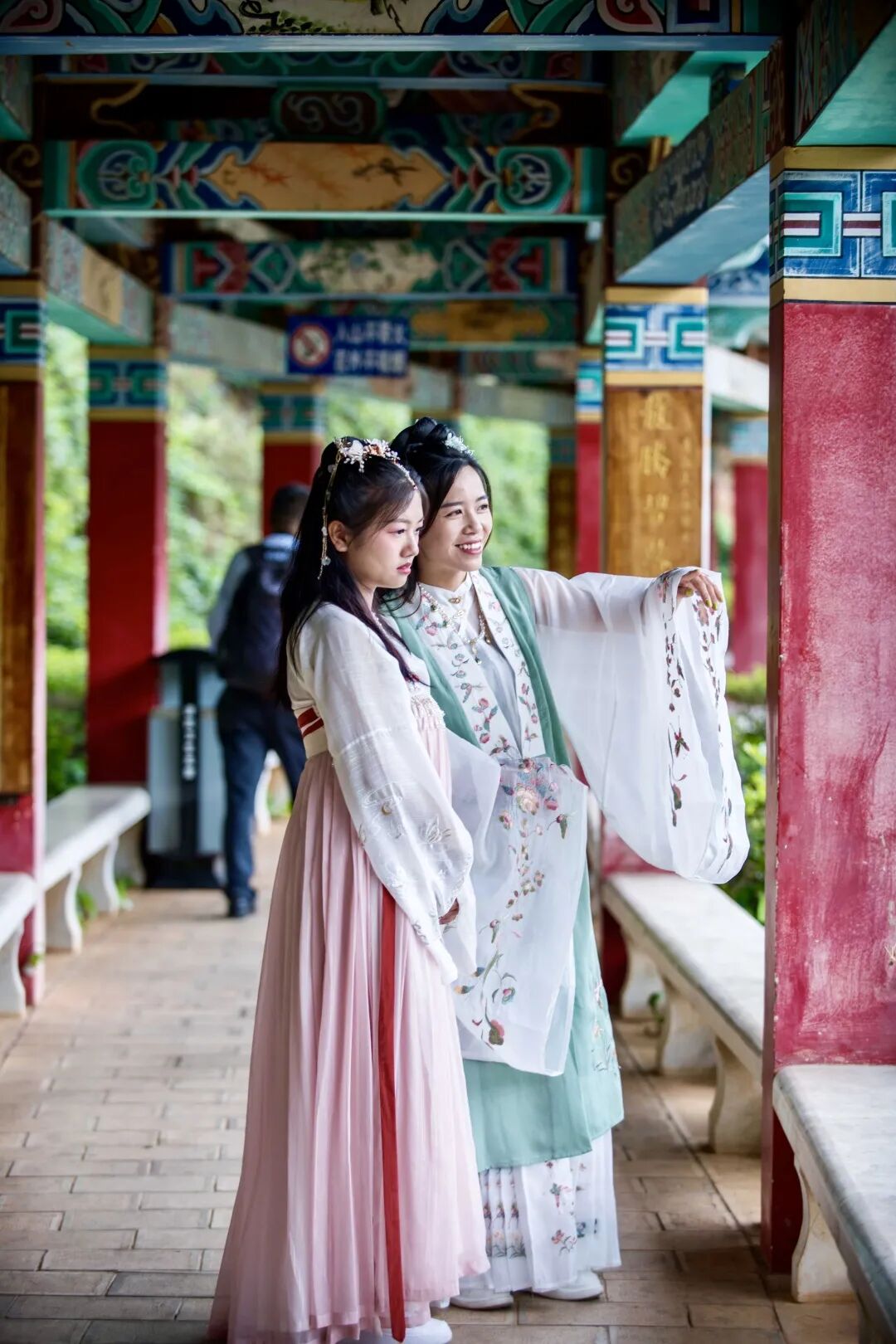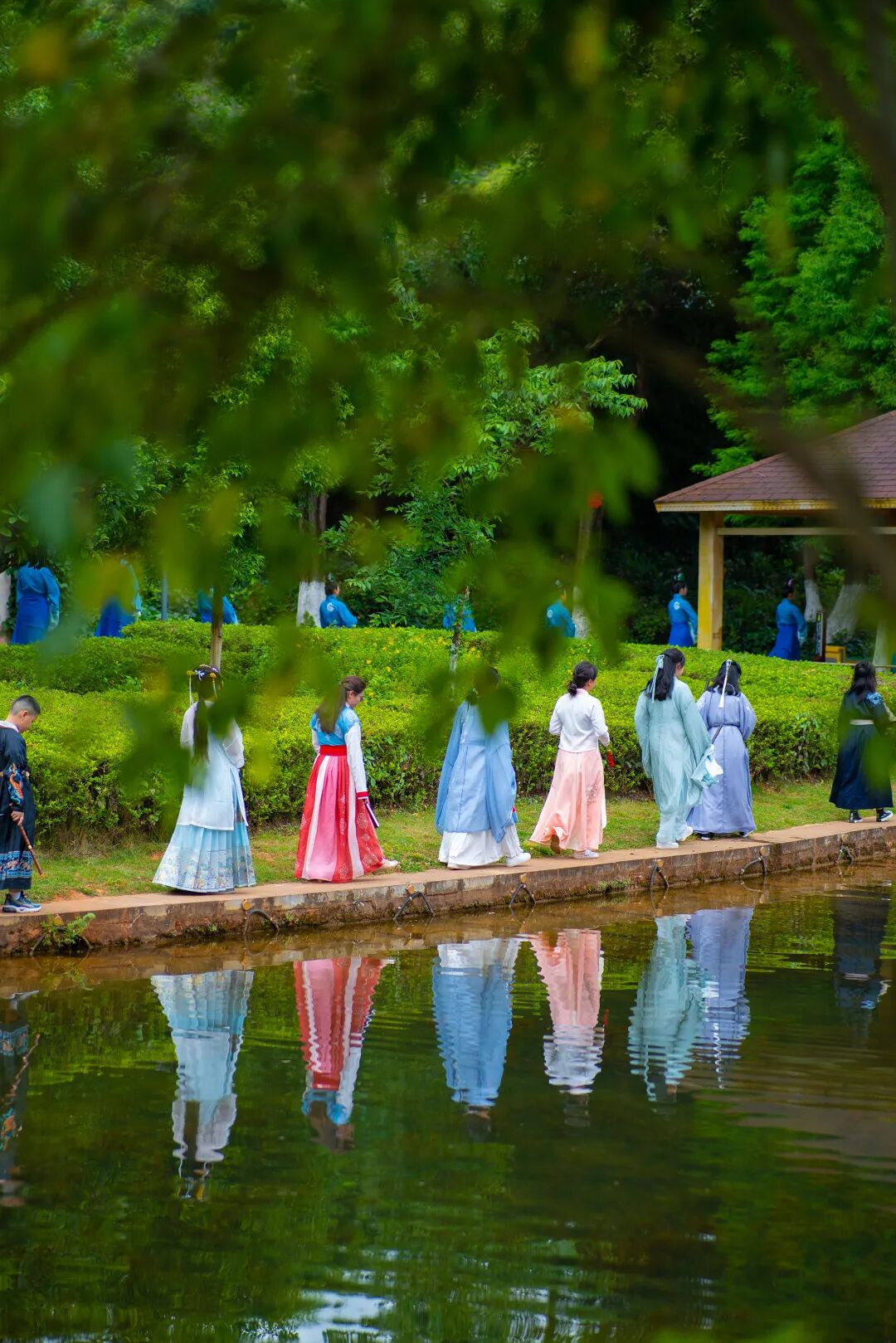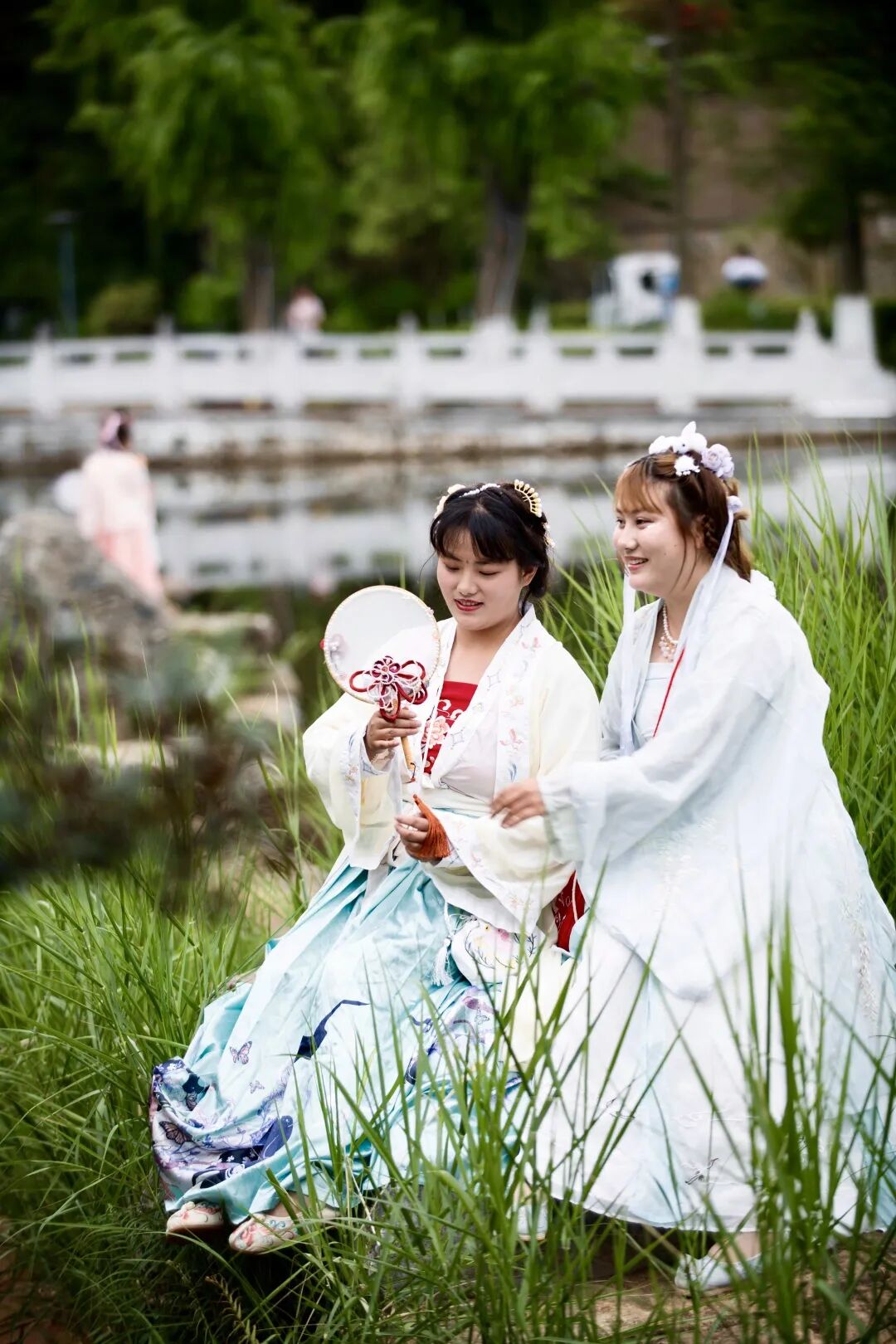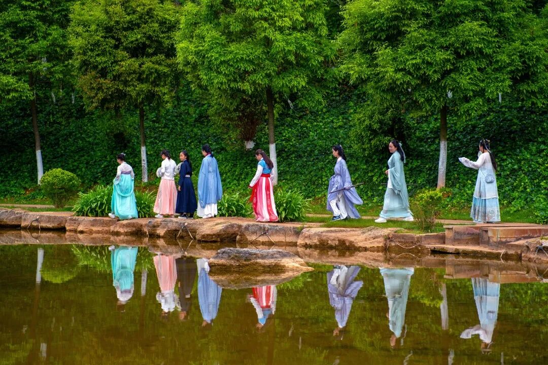 各式汉服虽形色各异,但神韵一脉,汉之素朴、唐之华美、宋之清雅、明之端庄,中华风骨在清丽的裙裾间流淌,绝代芳华搅动了水城初夏,惊艳了游人,也惊艳了时光。