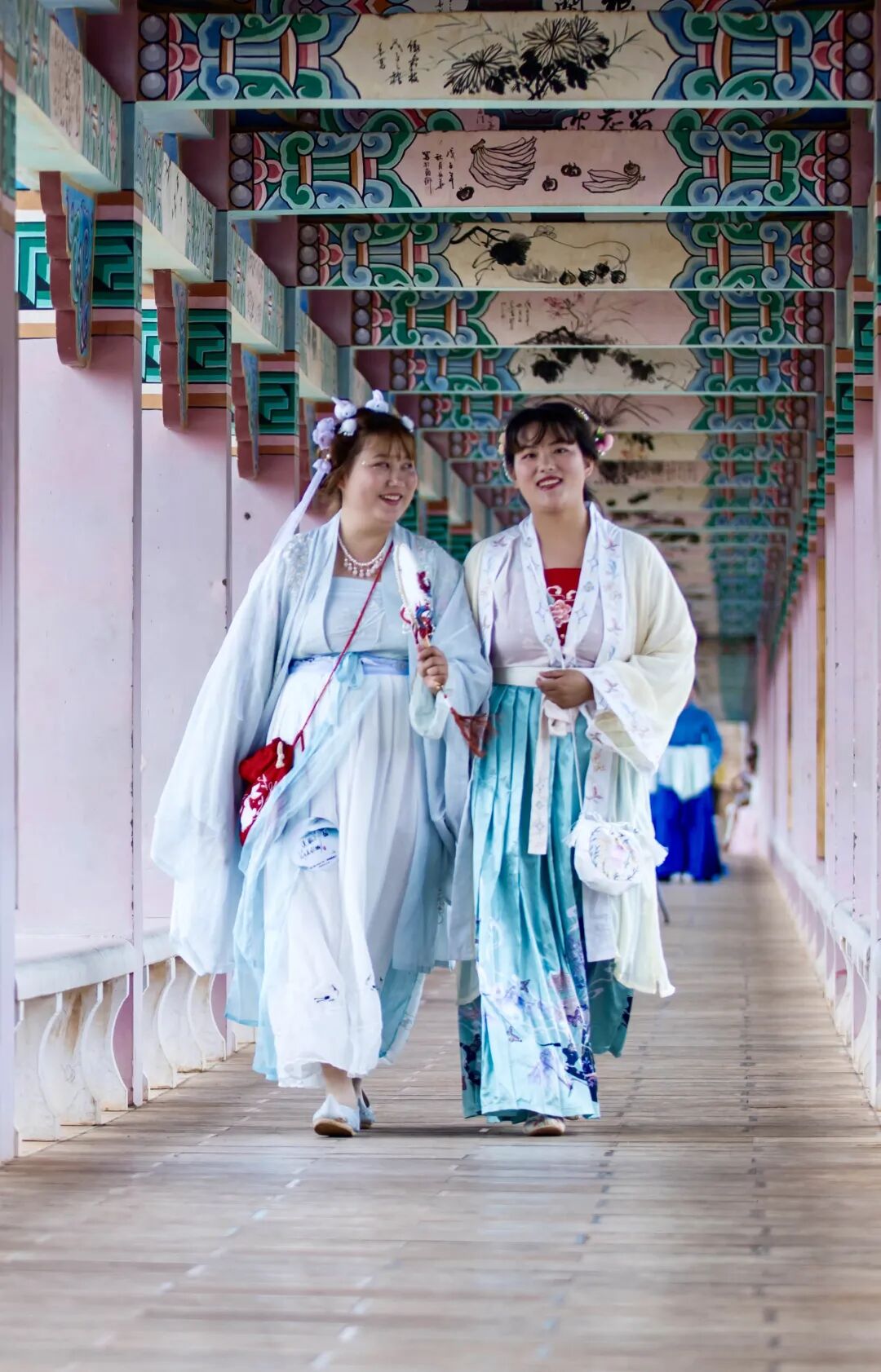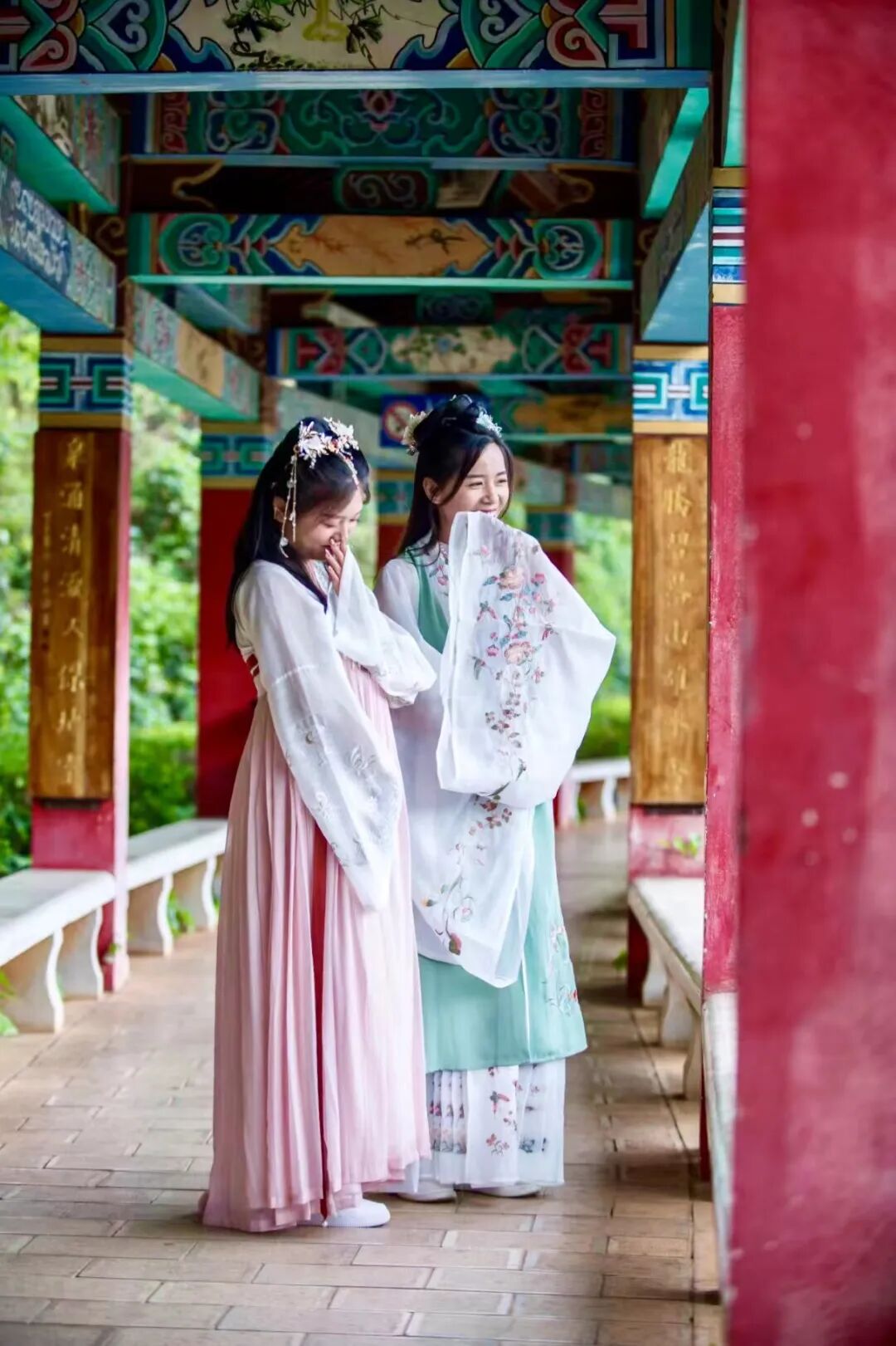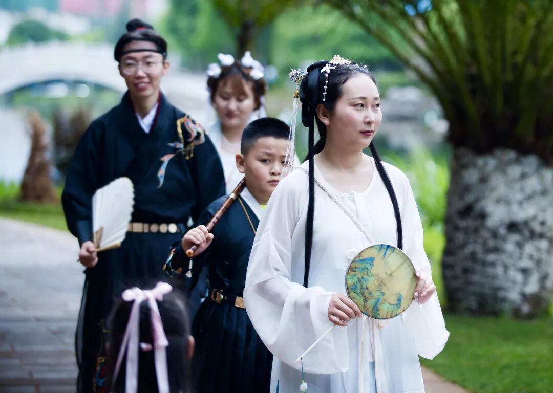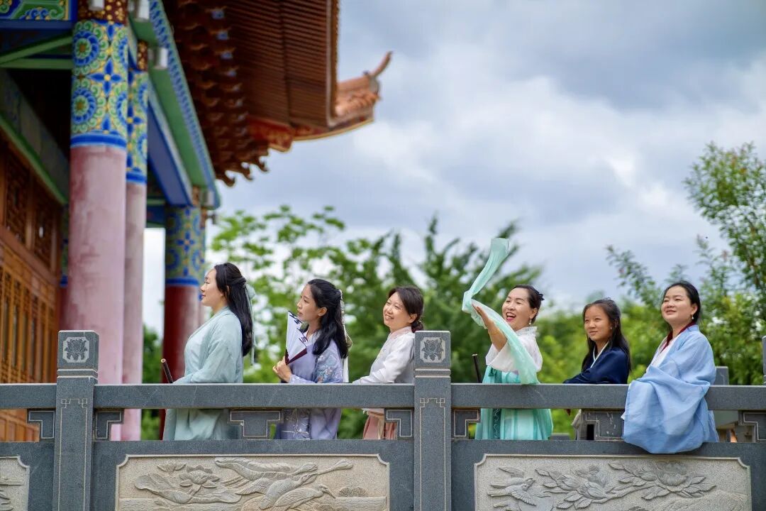 各式汉服虽形色各异,但神韵一脉,汉之素朴、唐之华美、宋之清雅、明之端庄,中华风骨在清丽的裙裾间流淌,绝代芳华搅动了水城初夏,惊艳了游人,也惊艳了时光。